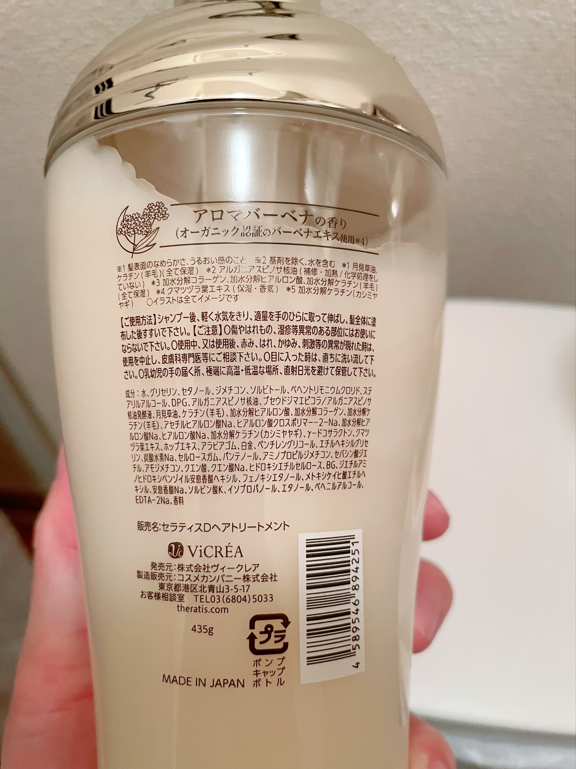 - <シャンプー435ml> 水、ラウロイルメチルアラニンNa、ラウラミドプロピルベタイン、ココイルメチルタウリンNa、コカミドプロピルベタイン、コカミドメチルMEA、オレフィン(C14-16)スルホン酸Na、グリセリン、アルガン油グリセレス-8エステルズ、アルガニアスピノサ核油、プセウドジマエピコラ/アルガニアスピノサ核油発酵液、月見草油、ケラチン(羊毛)、加水分解コラーゲン、加水分解ケラチン(羊毛)、加水分解ヒアルロン酸、アセチルヒアルロン酸Na、ヒアルロン酸クロスポリマー-2-Na、加水分解ヒアルロン酸Na、γ-ドコサラクトン、イランイラン花油、ホップエキス、アラビアゴム、白金、ペンチレングリコール、エチルヘキシルグリセリン、炭酸水素Na、セルロースガム、パンテノール、セバシン酸ジエチル、オウレン根エキス、ラウラミドプロピルヒドロキシスルタイン、ココイルグルタミン酸TEA、コカミドMEA、ポリクオタニウム-10、ミリスチルベタイン、クエン酸、EDTA-2Na、BG、カラメル、メトキシケイヒ酸エチルヘキシル、ジエチルアミノヒドロキシベンゾイル安息香酸ヘキシル、塩化Na、水酸化K、フェノキシエタノール、安息香酸Na、香料、PPG-7 <シャンプー詰替 325ml> 水、ラウロイルメチルアラニンNa、ラウラミドプロピルベタイン、ココイルメチルタウリンNa、コカミドプロピルベタイン、コカミドメチルMEA、オレフィン(C14-16)スルホン酸Na、グリセリン、アルガン油グリセレス-8エステルズ、アルガニアスピノサ核油、プセウドジマエピコラ/アルガニアスピノサ核油発酵液、月見草油、ケラチン(羊毛)、加水分解コラーゲン、加水分解ケラチン(羊毛)、加水分解ヒアルロン酸、アセチルヒアルロン酸Na、ヒアルロン酸クロスポリマー-2-Na、加水分解ヒアルロン酸Na、γ-ドコサラクトン、イランイラン花油、ホップエキス、アラビアゴム、白金、ペンチレングリコール、エチルヘキシルグリセリン、炭酸水素Na、セルロースガム、パンテノール、セバシン酸ジエチル、オウレン根エキス、ラウラミドプロピルヒドロキシスルタイン、ココイルグルタミン酸TEA、コカミドMEA、ポリクオタニウム-10、ミリスチルベタイン、クエン酸、EDTA-2Na、BG、カラメル、メトキシケイヒ酸エチルヘキシル、ジエチルアミノヒドロキシベンゾイル安息香酸ヘキシル、塩化Na、水酸化K、フェノキシエタノール、安息香酸Na、香料、PPG-7 <ヘアトリートメント435g> 水、グリセリン、セタノール、ジメチコン、ソルビトール、ベヘントリモニウムクロリド、ステアリルアルコール、アルガニアスピノサ核油、プセウドジマエピコラ/アルガニアスピノサ核油発酵液、月見草油、ケラチン(羊毛)、加水分解ヒアルロン酸、加水分解コラーゲン、加水分解ケラチン(羊毛)、アセチルヒアルロン酸Na、加水分解ヒアルロン酸Na、ヒアルロン酸Na、加水分解ケラチン(カシミヤヤギ)、γ-ドコサラクトン、クマツヅラ葉エキス、ホップエキス、アラビアゴム、白金、ペンチレングリコール、エチルヘキシルグリセリン、炭酸水素Na、セルロースガム、パンテノール、アミノプロピルジメチコン、セバシン酸ジエチル、アモジメチコン、クエン酸、クエン酸Na、ヒドロキシエチルセルロース、BG、黄4、黄5、ジエチルアミノヒドロキシベンゾイル安息香酸ヘキシル、フェノキシエタノール、メトキシケイヒ酸エチルヘキシル、安息香酸Na、ソルビン酸K、イソプロパノール、香料 <ヘアトリートメント詰替 325g> 水、グリセリン、セタノール、ジメチコン、ソルビトール、ベヘントリモニウムクロリド、ステアリルアルコール、アルガニアスピノサ核油、プセウドジマエピコラ/アルガニアスピノサ核油発酵液、月見草油、ケラチン(羊毛)、加水分解ヒアルロン酸、加水分解コラーゲン、加水分解ケラチン(羊毛)、アセチルヒアルロン酸Na、加水分解ヒアルロン酸Na、ヒアルロン酸Na、加水分解ケラチン(カシミヤヤギ)、γ-ドコサラクトン、クマツヅラ葉エキス、ホップエキス、アラビアゴム、白金、ペンチレングリコール、エチルヘキシルグリセリン、炭酸水素Na、セルロースガム、パンテノール、アミノプロピルジメチコン、セバシン酸ジエチル、アモジメチコン、クエン酸、クエン酸Na、ヒドロキシエチルセルロース、BG、黄4、黄5、ジエチルアミノヒドロキシベンゾイル安息香酸ヘキシル、フェノキシエタノール、メトキシケイヒ酸エチルヘキシル、安息香酸Na、ソルビン酸K、イソプロパノール、香料