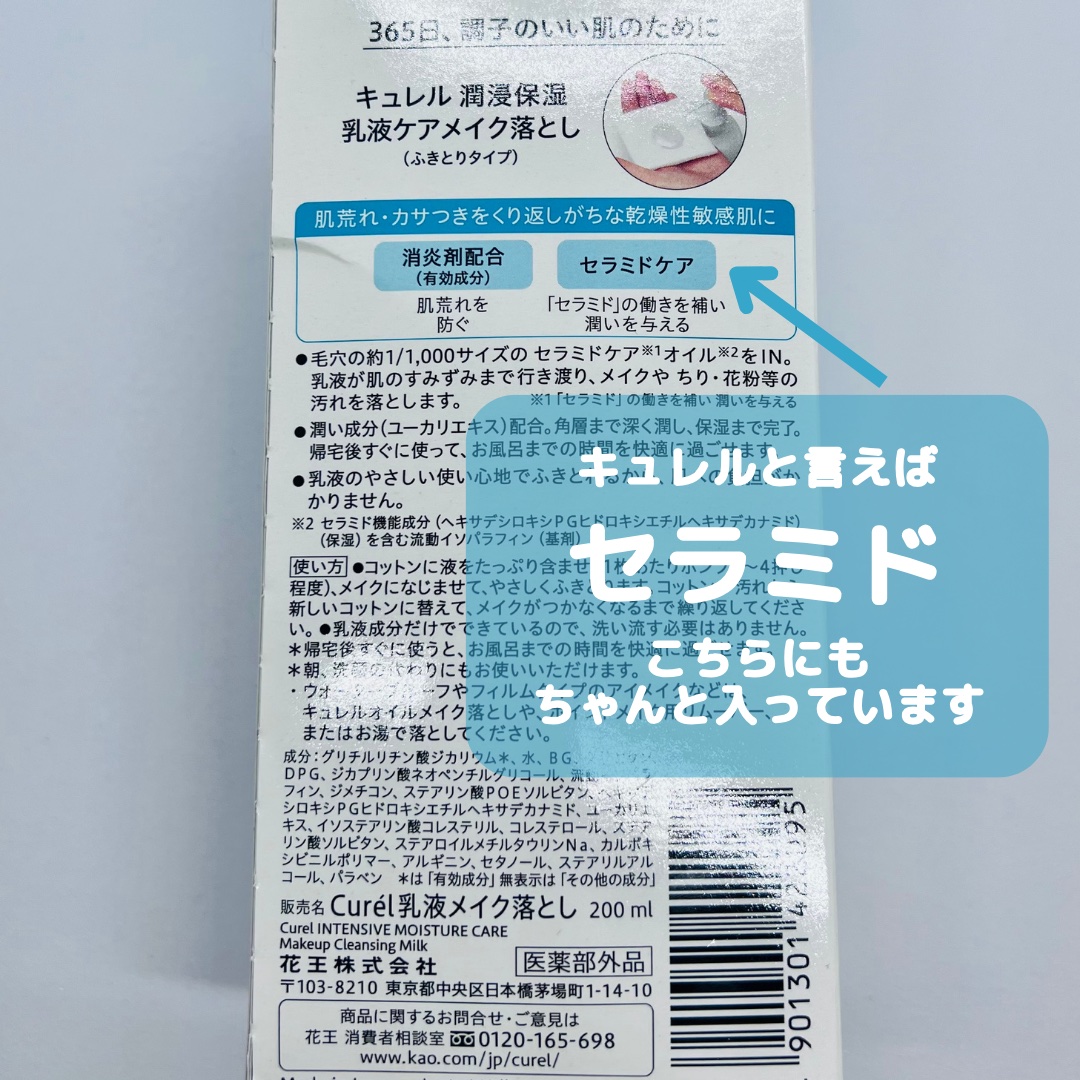 保湿ケアもできるふき取りタイプで洗い流し不要なので とてもらくです。 キュレルといえば弱酸性やセラミドケア。 もちろんこちらのメイク落としもセラミドケアができます。 消炎剤配合なので肌荒れを防いでくれる機能も。 落とすのにケア。これは嬉しい。 元々メイク直しは乳液をコットンにつけ元のメイクを落としていたのですがこの考えはなかった! こちら、普通の乳液より柔らかいテクスチャーで馴染みが良いです。