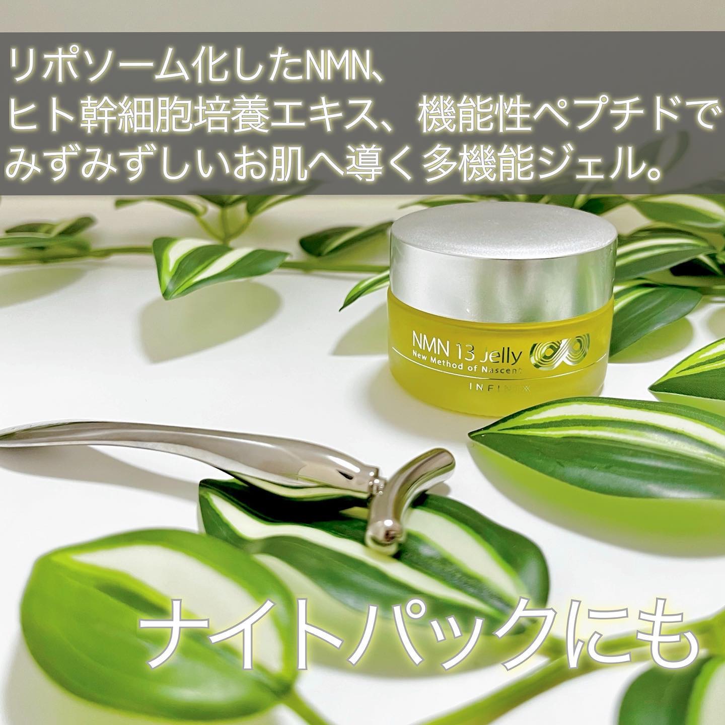 - 日本初*1 NMN*2・ヒト幹細胞培養エキス*2・機能性ペプチド*2配合の保湿美容ジェル。厳選された13の美容成分が、みずみずしいお肌のスイッチを呼び醒まします。付属のスパチュラ兼マッサージツール『コントゥーラー』との組み合わせで、お顔を上向き印象へ。『NMN 13セラム』との相性も良く、さっぱりとした使い心地ながら、お肌をラッピングして潤いを保ちます。 *1・調査名:「NMN化粧品に関する調査」(TPCマーケティングリサーチ㈱調べ)・調査対象:1.「@cosme」に記載のあるNMN配合化粧品 2.「楽天市場」「Amazon」「Yahoo!ショッピング」で販売されているNMN配合化粧品 3.その他MLMチャネルで販売されているNMN配合化粧品のいずれかに該当するもの ・調査期間:2022年4月1日~20日 *2保湿成分