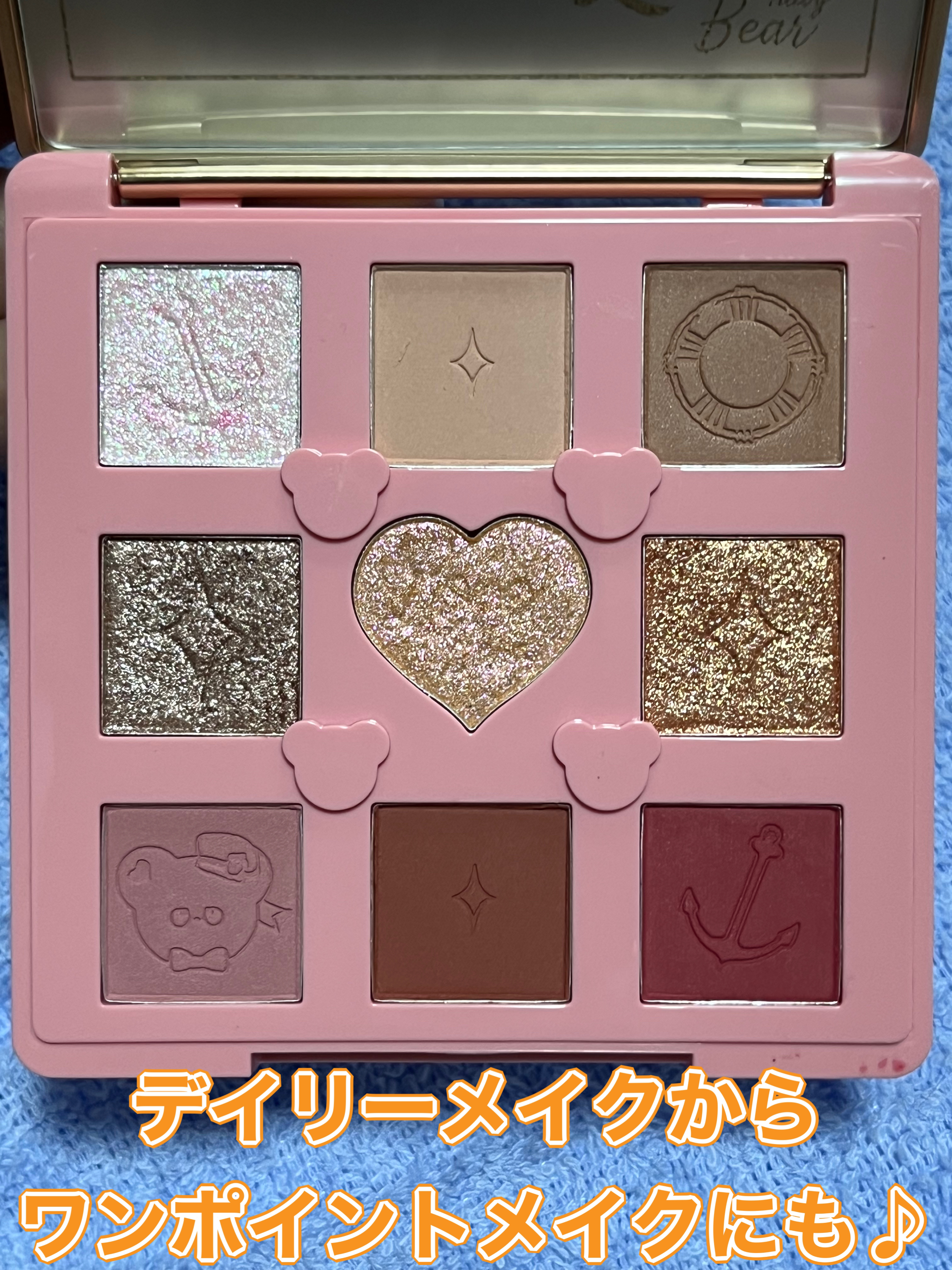 思わずパケ買いしたくなるようなアイシャドウパレット発見🧸💗 廃盤だからかQoo10で見当たらなくて欲しすぎてメルカリでGET アイシャドウの発色も薄めから濃いめまで揃ってて特に下の3色は濃いけどマットだからアイシャドウだけじゃなくアイブロウとしても使える アイシャドウにはほのかな甘い香りが付いてるよ🫶🏻