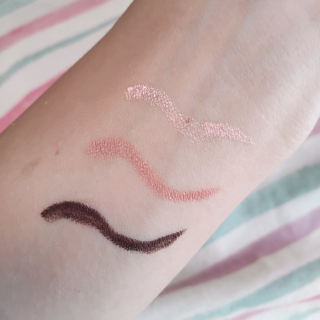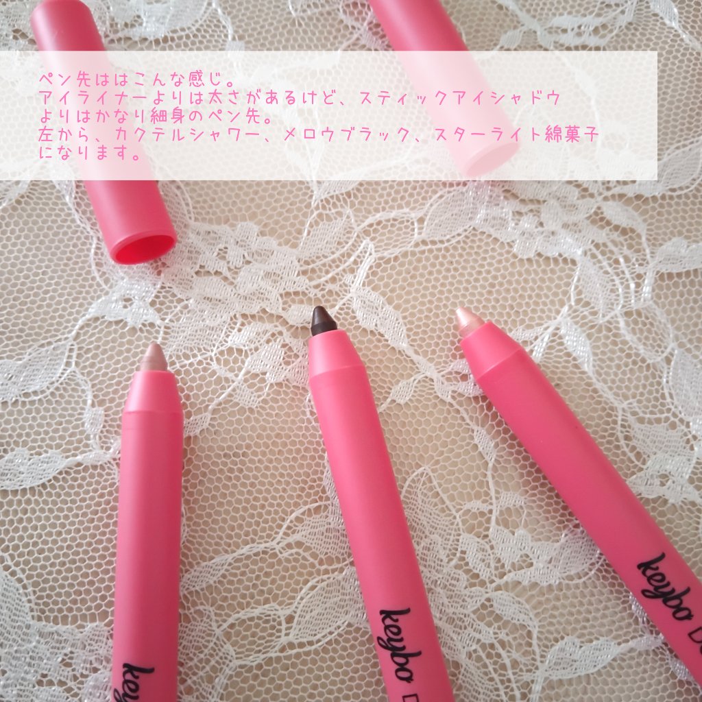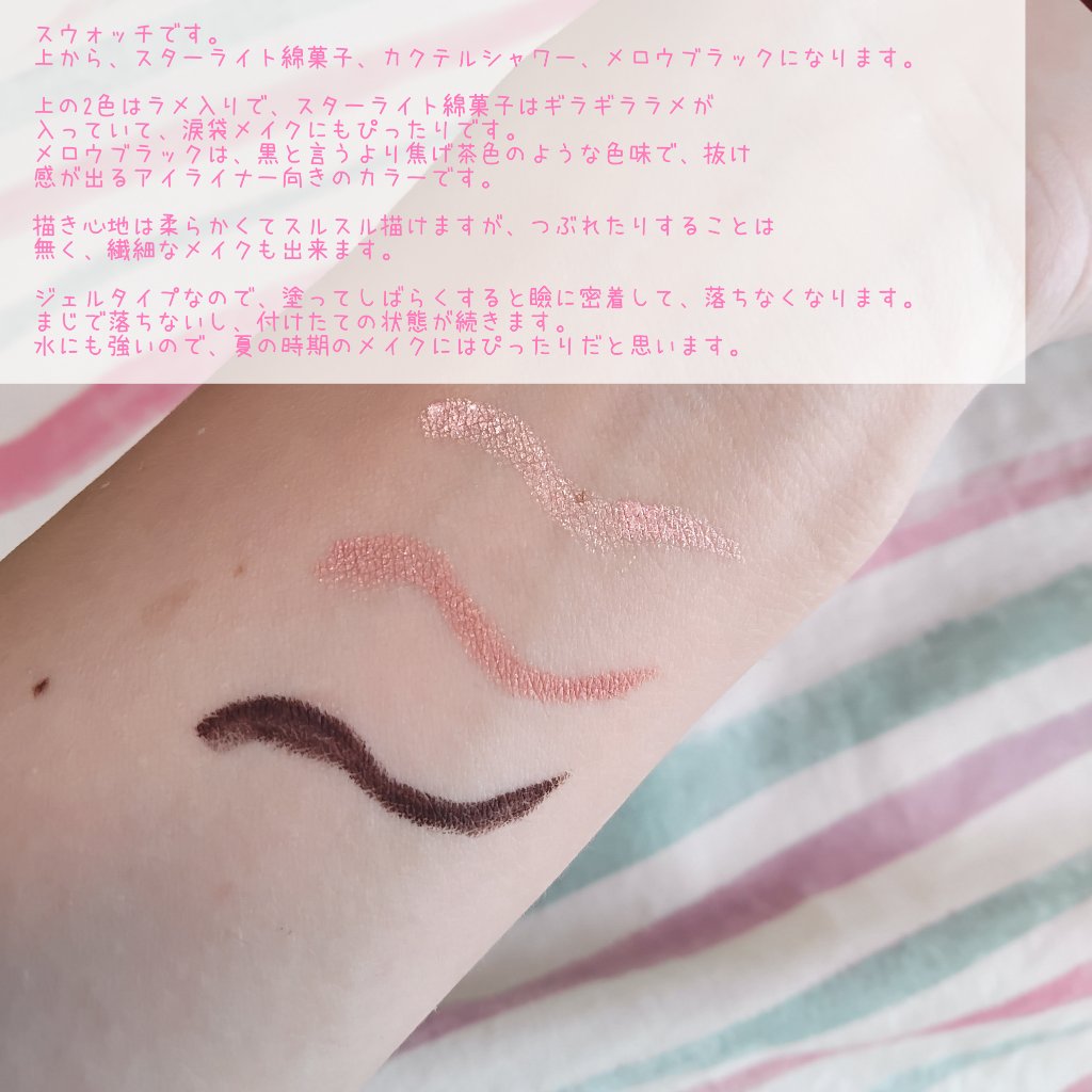 ジェルライナーだから柔らかめの芯でスルスルとした描き心地✨ 肌にピタッと密着するからヨレにくい♡ メロウブラック マットな質感の黒で、目力が増す(メイクアップ効果による)目尻の跳ね上げを描いた後すぐに指でスーッとぼかすと自然な仕上がりになって好き♡ スターライト綿菓子 繊細なラメ?入りで光沢感がでる✨ 涙袋に使用しても肌に馴染むカラーだから違和感なく仕上がる♡