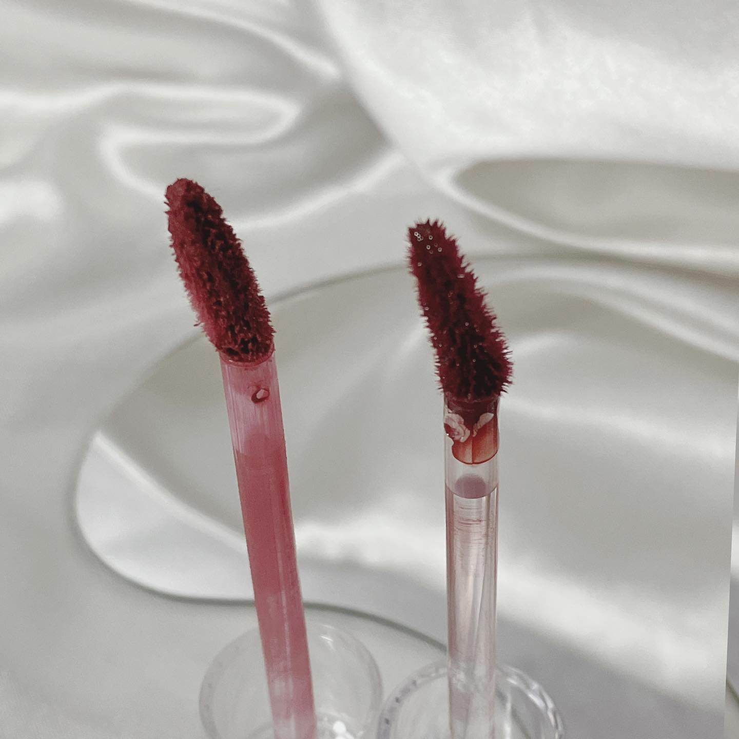 柔らかいベルベットテクスチャー。落ち着いた雰囲気のカラーが多い印象です。柔らかく薄く伸ばせて唇に密着するのでティッシュオフしても色が残っている印象。 まろやかでソフトなカラーがかわいすぎる🥹✨ みずみずしいツヤ感も綺麗💗 塗り心地は軽めでベタつく感じも少ないです🫧 ベルベットとグローを重ねて使っても可愛い🥹💗
