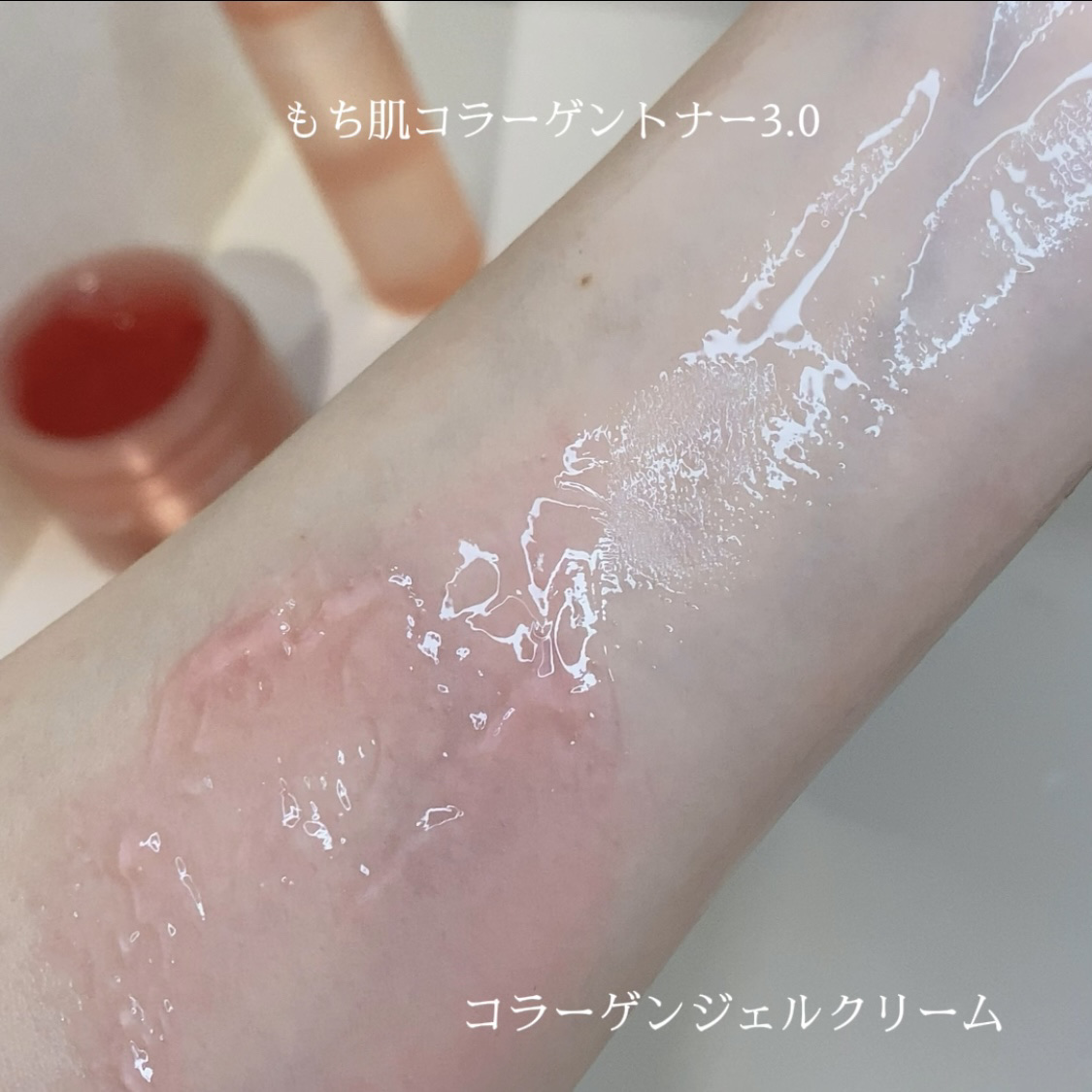 - とろっとしたテクスチャーのトナーです。 お花のようなふんわりとした香りがします。 とろっとしていますが、お肌の角質層へしっかり浸透し、コラーゲンでお肌を潤わし、もちもち肌へと導きます。