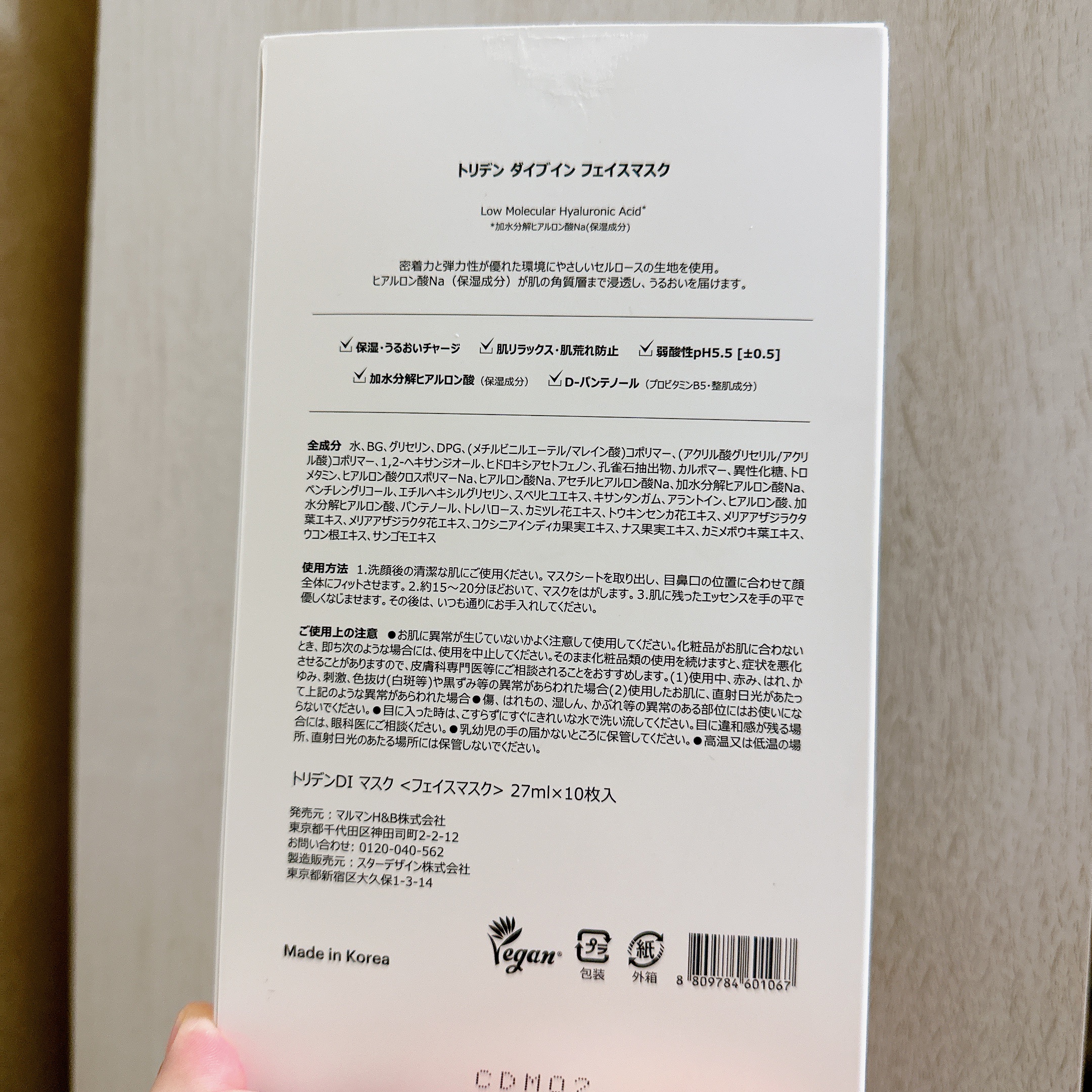 - <1枚> 水、BG、グリセリン、DPG、(メチルビニルエーテル/マレイン酸)コポリマー、(アクリル酸グリセリル/アクリル酸)コポリマー、1,2-ヘキサンジオール、ヒドロキシアセトフェノン、孔雀石抽出物、カルボマー、異性化糖、トロメタミン、ヒアルロン酸クロスポリマーNa、ヒアルロン酸Na、アセチルヒアルロン酸Na、加水分解ヒアルロン酸Na、ペンチレングリコール、エチルヘキシルグリセリン、スベリヒユエキス、キサンタンガム、アラントイン、ヒアルロン酸、加水分解ヒアルロン酸、パンテノール、トレハロース、カミツレ花エキス、トウキンセンカ花エキス、メリアアザジラクタ葉エキス、メリアアザジラクタ花エキス、コクシニアインディカ果実エキス、ナス果実エキス、カミメボウキ葉エキス、ウコン根エキス、サンゴモエキス <3枚> 水、BG、グリセリン、DPG、(メチルビニルエーテル/マレイン酸)コポリマー、(アクリル酸グリセリル/アクリル酸)コポリマー、1,2-ヘキサンジオール、ヒドロキシアセトフェノン、乳雀石抽出物、カルボマー、異性化糖、トロメタミン、ヒアルロン酸クロスポリマーNa、ヒアルロン酸Na、アセチルヒアルロン酸Na、加水分解ヒアルロン酸Na、ペンチレングリコール、エチルヘキシルグリセリン、スベリヒユエキス、キサンタンガム、アラントイン、ヒアルロン酸、加水分解ヒアルロン酸、パンテノール、トレハロース、カミツレ花エキス、トウキンセンカ花エキス、メリアアザジラクタ葉エキス、メリアアザジラクタ花エキス、コクシニアインディカ果実エキス、ナス果実エキス、カミメボウキ葉エキス、ウコン根エキス、サンゴモエキス <10枚> 水、BG、グリセリン、DPG、(メチルビニルエーテル/マレイン酸)コポリマー、(アクリル酸グリセリル/アクリル酸)コポリマー、1,2-ヘキサンジオール、ヒドロキシアセトフェノン、孔雀石抽出物、カルボマー、異性化糖、トロメタミン、ヒアルロン酸クロスポリマーNa、ヒアルロン酸Na、アセチルヒアルロン酸Na、加水分解ヒアルロン酸Na、ペンチレングリコール、エチルヘキシルグリセリン、スベリヒユエキス、キサンタンガム、アラントイン、ヒアルロン酸、加水分解ヒアルロン酸、パンテノール、トレハロース、カミツレ花エキス、トウキンセンカ花エキス、メリアアザジラクタ葉エキス、メリアアザジラクタ花エキス、コクシニアインディカ果実エキス、ナス果実エキス、カミメボウキ葉エキス、ウコン根エキス、サンゴモエキス