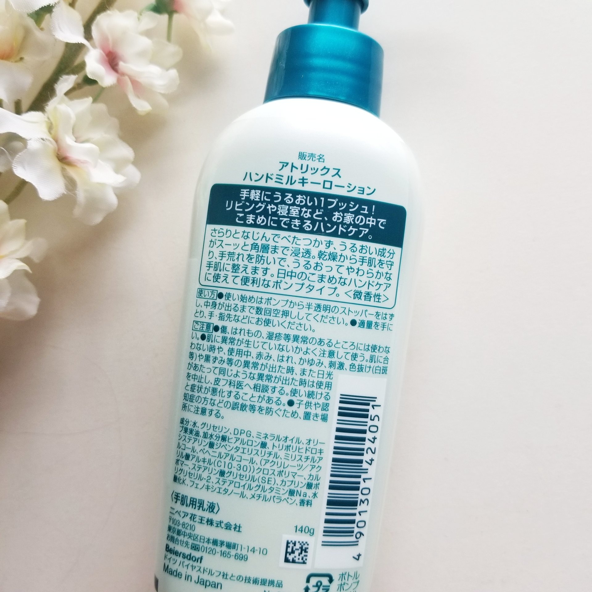 ブランド:atrixアトリックス品名:ハンドミルキーローション香り:微香性価格(税込み):764円・うるおい成分:浸透型ヒアルロン酸配合今の仕事を始めてから秋冬に手の乾燥に悩まされるようになったので、ネットで調べて手の乾燥対策でハンドクリーム...