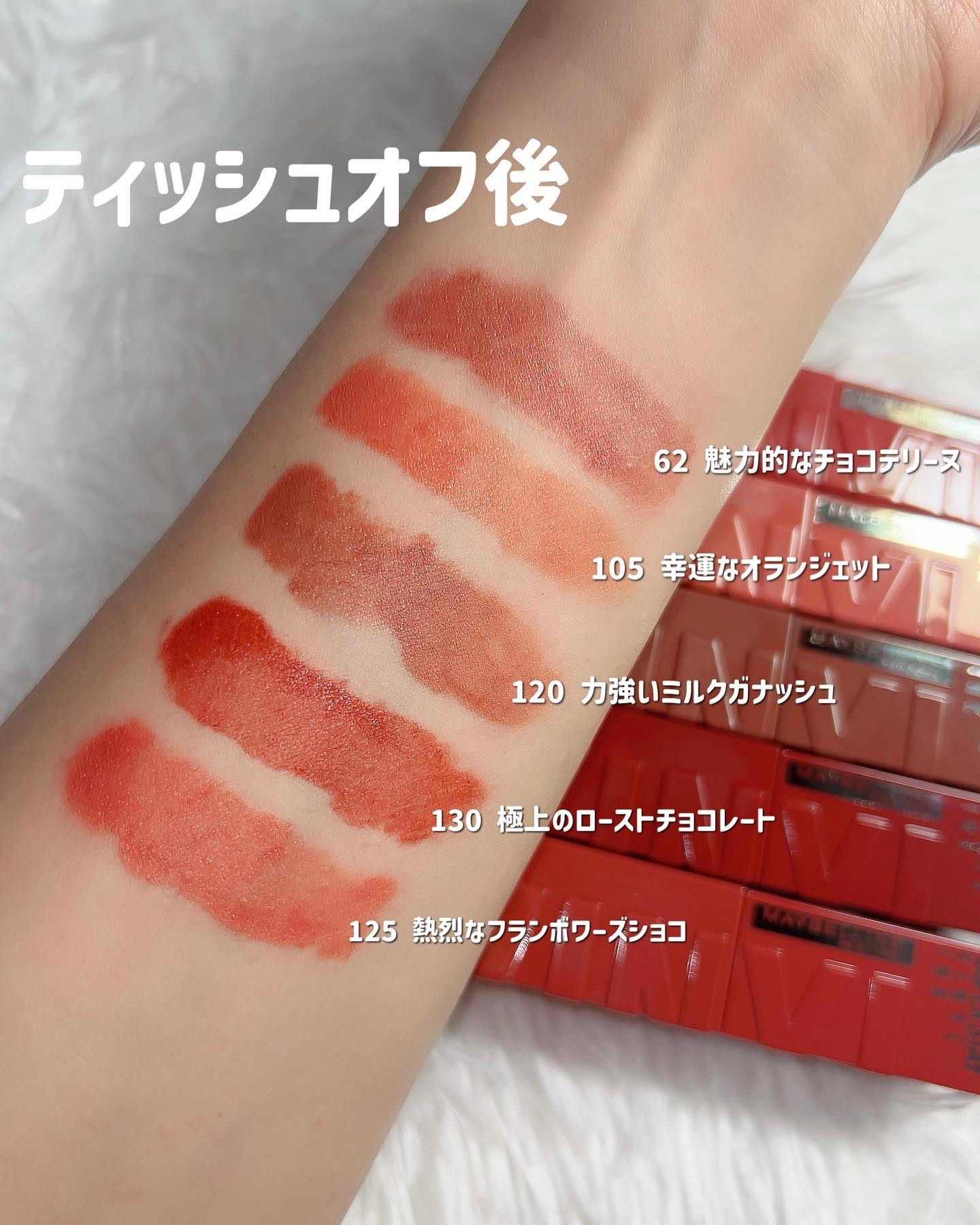 初のマットリップで発売前から楽しみすぎてました😭💖 絶対人気カラーの03じらしプラムがやっぱり1番かわいい😭💖 意外と02の微レッドカラーが唇に乗せるとそこまで発色しない🤔肌なじみ良いカラーになるから使いやすいかも◎ 01のピンクは青みっぽくなくて誰でも使えるようなピンク🎀 ティッシュオフしても色味そのままでマスクメイクに最適✨✨ マットだけど乾燥は特に気にならず!クレンジングオフしても縦じわに残ったりしないからめっちゃ良い😭😭💖