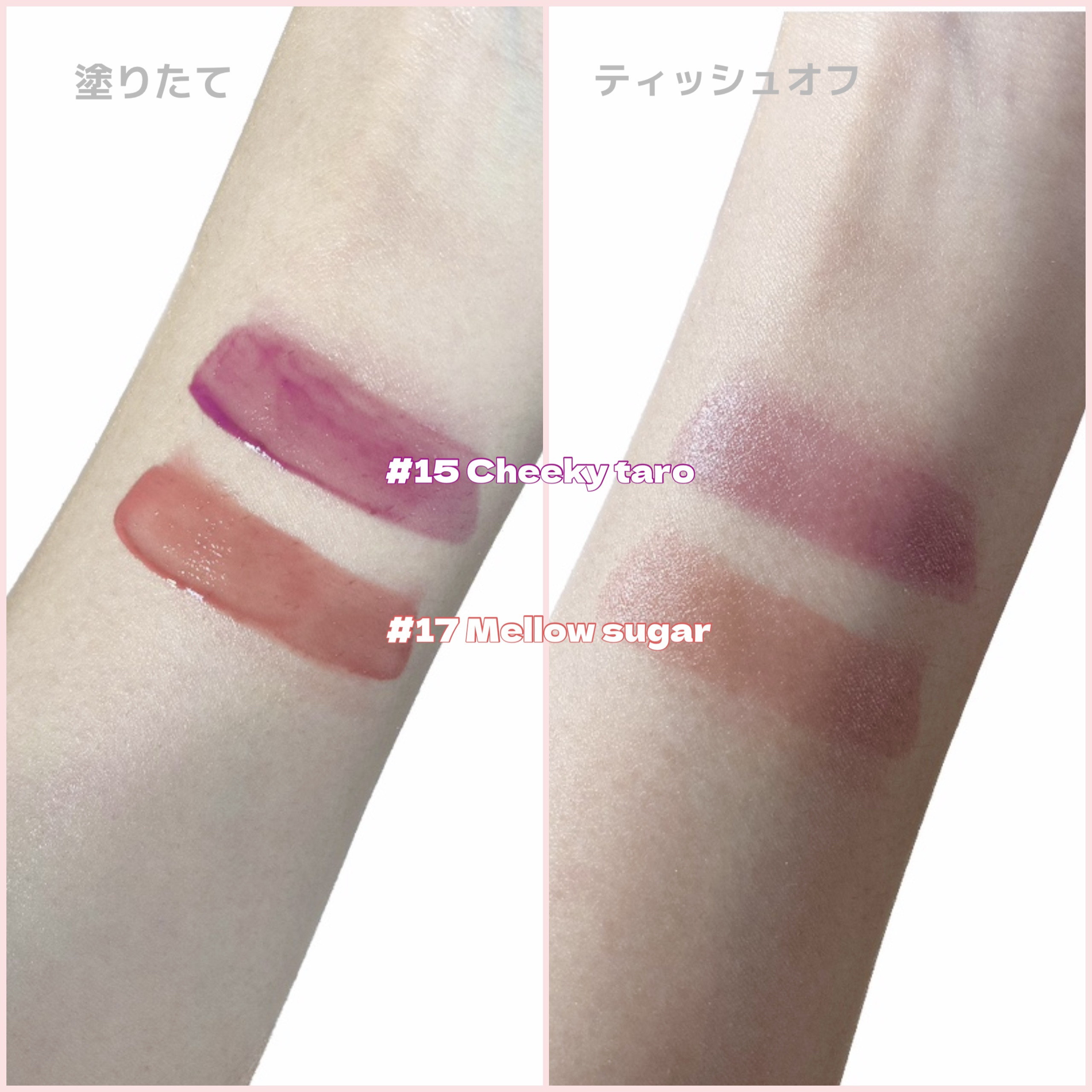 - <01 インコーラル> 水、ビスジグリセリルポリアシルアジペート-2、グリセリン、ジフェニルジメチコン、ジフェニルシロキシフェニルトリメチコン、ポリグリセリン-3、リンゴ酸ジイソステアリル、水添ポリイソブテン、ポリブテン、トリメチルシロキシフェニルジメチコン、変性アルコール、ポリソルベート60、イソノナン酸イソノニル、ペンチレングリコール、(アクリル酸ヒドロキシエチル/アクリロイルジメチルタウリンNa)コポ リマー、ラベンダーエキス、ハナハッカ花/葉/茎エキス、ローズマリーエキス、タイムエキス、ステアリン酸グリセリル、ステアリン酸PEG-100、スクワラン、ラウリルPEG-10トリス(トリメチルシロキシ)シリルエチルジメチコン、エチルヘキシルグリセリン、デキストリン、ステビオシド、イソステアリン酸ソルビタン、エチレンジアミンジコハク酸3Na、水酸化Al、ポリアクリル酸アンモニウム、BG、トコフェロール、フェノキシエタノール、香料、リモネン、酸化チタン、黄5、赤227、黄4、青1 <03 イフローズ> 水、ビスジグリセリルポリアシルアジペート-2、グリセリン、ジフェニルジメチコン、ジフェニルシロキシフェニルトリメチコン、ポリグリセリン-3、リンゴ酸ジイソステアリル、水添ポリイソブテン、ポリブテン、トリメチルシロキシフェニルジメチコン、変性アルコール、ポリソルベート60、イソノナン酸イソノニル、ペンチレングリコール、(アクリル酸ヒドロキシエチル/アクリロイルジメチルタウリンNa)コポリマー、ラベンダーエキス、ハナハッカ花/葉/茎エキス、ローズマリーエキス、タイムエキス、ステアリン酸グリセリル、ステアリン酸PEG-100、スクワラン、ラウリルPEG-10トリス(トリメチルシロキシ)シリルエチルジメチコン、エチルヘキシルグリセリン、デキストリン、ステビオシド、トリイソステアリン酸ポリグリセリル-2、イソステアリン酸ソルビタン、エチレンジアミンジコハク酸3Na、水酸化Al、ポリアクリル酸アンモニウム、BG、トコフェロール、フェノキシエタノール、香料、リモネン、酸化チタン、黄5、赤227、青1、黄4、赤218 <04 チリアップ> 水、ビスジグリセリルポリアシルアジペート-2、グリセリン、ジフェニルジメチコン、ジフェニルシロキシフェニルトリメチコン、ポリグリセリン-3、リンゴ酸ジイソステアリル、水添ポリイソブテン、ポリブテン、トリメチルシロキシフェニルジメチコン、変性アルコール、ポリソルベート60、イソノナン酸イソノニル、ペンチレングリコール、(アクリル酸ヒドロキシエチル/アクリロイルジメチルタウリンNa)コポ リマー、ラベンダーエキス、ハナハッカ花/葉/茎エキス、ローズマリーエキス、タイムエキス、ステアリン酸グリセリル、ステアリン酸PEG-100、スクワラン、ラウリルPEG-10トリス(トリメチルシロキシ)シリルエチルジメチコン、エチルヘキシルグリセリン、デキストリン、ステビオシド、イソステアリン酸ソルビタン、エチレンジアミンジコハク酸3Na、トコフェロール、BG、フェノキシエタノール、料、リモネン、黄5、赤227、黄4、青1 <06 チュリアン> 水、ビスジグリセリルポリアシルアジペート-2、グリセリン、ジフェニルジメチコン、ジフェニルシロキシフェニルトリメチコン、ポリグリセリン-3、リンゴ酸ジイソステアリル、水添ポリイソブテン、ポリブテン、トリメチルシロキシフェニルジメチコン、変性アルコール、ポリソルベート60、イソノナン酸イソノニル、ペンチレングリコール、(アクリル酸ヒドロキシエチル/アクリロイルジメチルタウリンNa)コポリマー、ラベンダーエキス、ハナハッカ花/葉/茎エキス、ローズマリーエキス、タイムエキス、ステアリン酸グリセリル、ステアリン酸PEG-100、スクワラン、ラウリルPEG-10トリス(トリメチルシロキシ)シリルエチルジメチコン、エチルヘキシルグリセリン、デキストリン、ステビオシド、イソステアリン酸ソルビタン、エチレンジアミンジコハク酸3Na、水酸化Al、ポリアクリル酸アンモニウム、BG、トコフェロール、フェノキシエタノール、香料、リモネン、酸化チタン、黄5、赤227、酸化鉄、黄4、赤218、青1 <08 ベリーディヴァイン> 水、ビスジグリセリルポリアシルアジペート-2、グリセリン、ジフェニルジメチコン、ジフェニルシロキシフェニルトリメチコン、ポリグリセリン-3、リンゴ酸ジイソステアリル、水添ポリイソブテン、ポリブテン、トリメチルシロキシフェニルジメチコン、変性アルコール、ポリソルベート60、イソノナン酸イソノニル、ペンチレングリコール、(アクリル酸ヒドロキシエチル/アクリロイルジメチルタウリンNa)コポリマー、ラベンダーエキス、ハナハッカ花/葉/茎エキス、ローズマリーエキス、タイムエキス、ステアリン酸グリセリル、ステアリン酸PEG-100、スクワラン、ラウリルPEG-10トリス(トリメチルシロキシ)シリルエチルジメチコン、エチルヘキシルグリセリン、イソステアリン酸ソルビタン、デキストリン、ステビオシド、エチレンジアミン