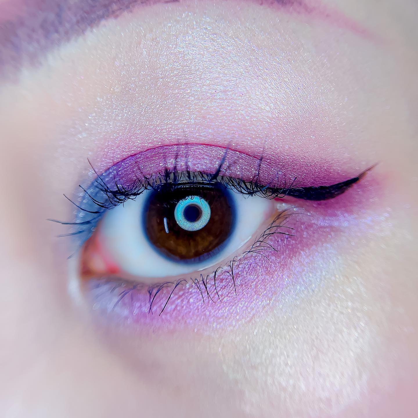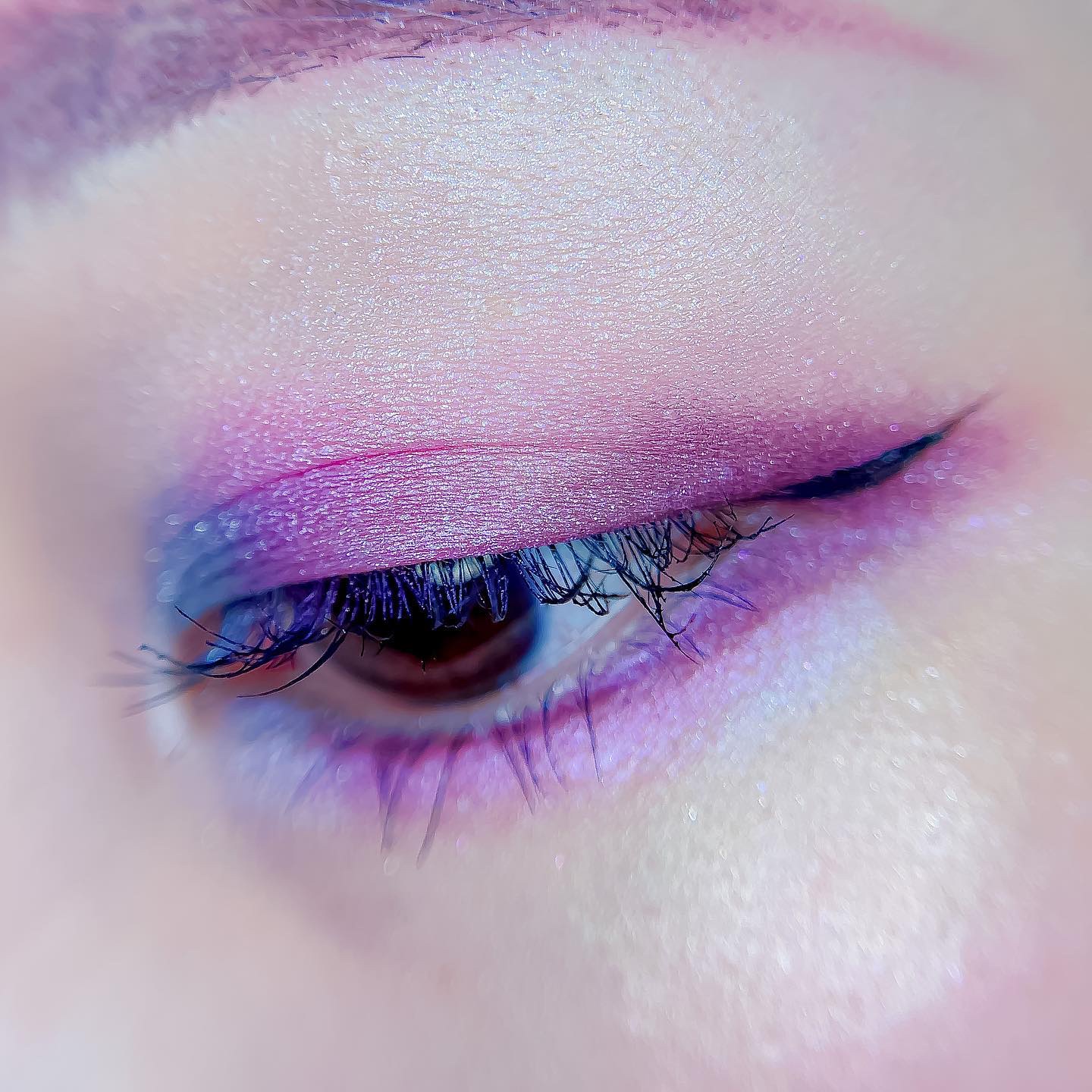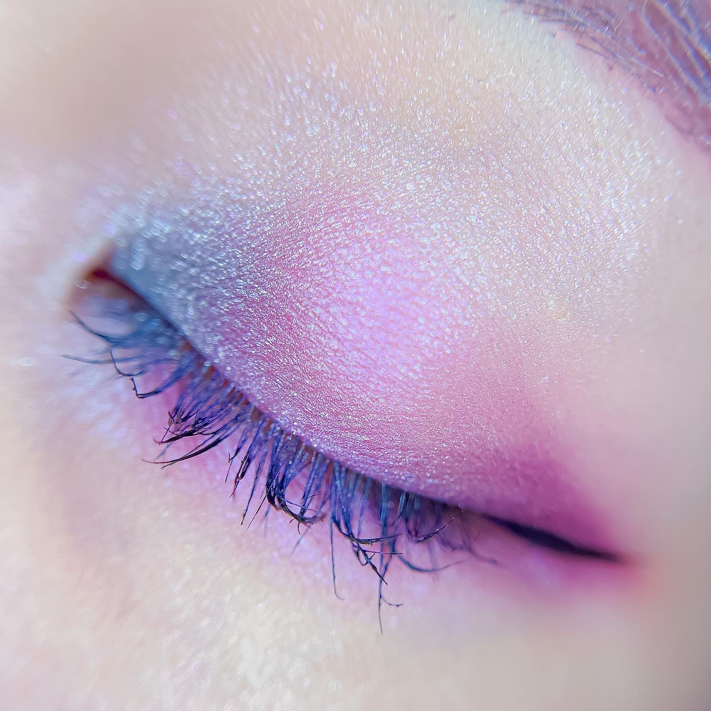 ベースに右上、目頭から黒目上に真ん中、黒目〜目尻に右下を、左上を目頭にくの字に塗ってもらいました✨ ピンクサクラよりもクールな感じで、目で見た色より私の肌では紫っぽく発色しました😍 上2つはラメはぎっしりでときめく💓 ブラウンメイクがとても苦手だけれどこれならブラウンメイク出来そう👌(かなり紫寄りですが) くすみ感は強いので苦手な方は厳しいかも…(特に真ん中) クールな印象になるので大人顔さん向けor大人顔になりたい方向けのイメージです✨
