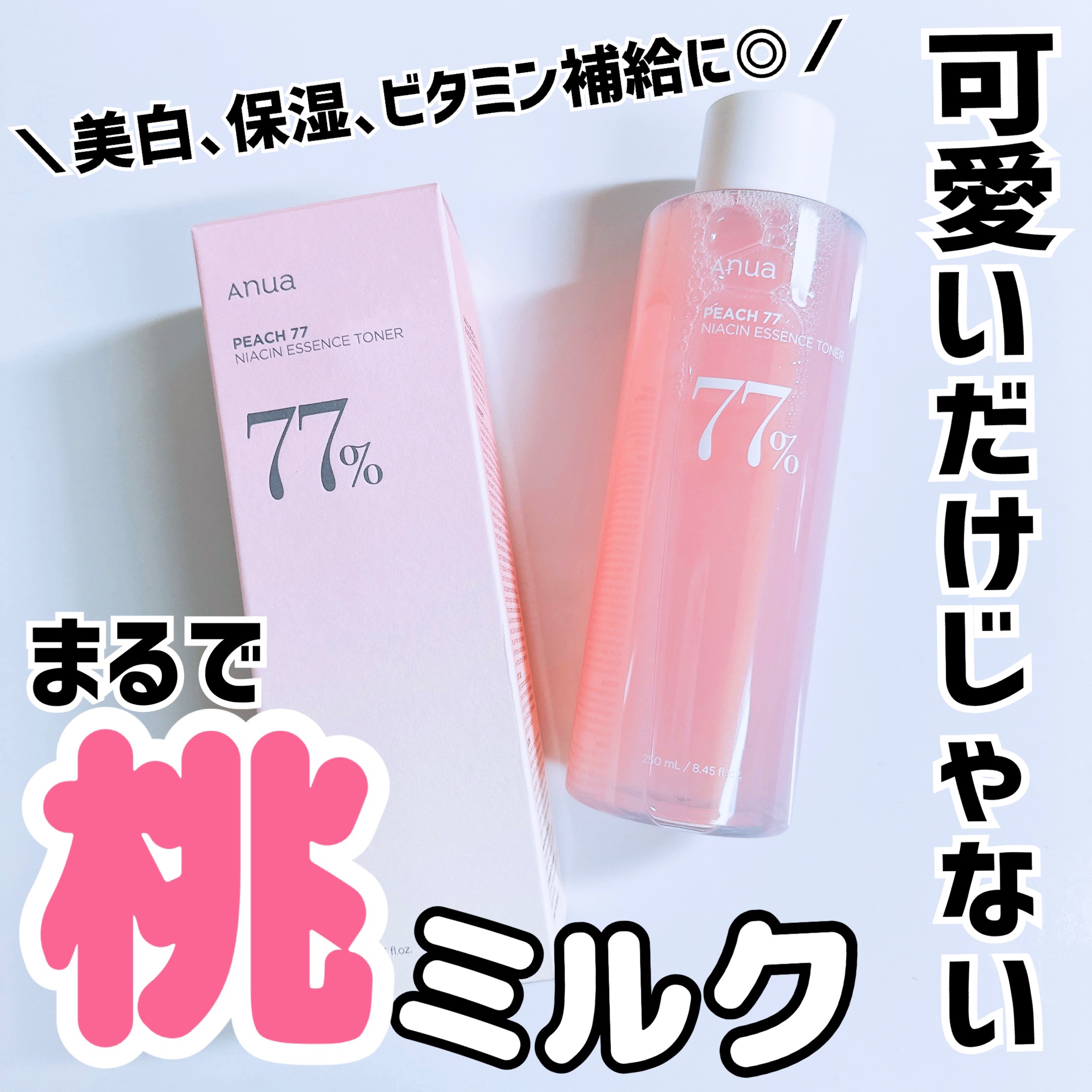 少しとろみのあるテクスチャー べたつかき感なくてスッと肌になじんで肌を保湿してくれるので朝のスキンケアにも使いやすかったです ほんのり桃の香りがするのですが結構お気に入りでよくコットンパックとして使うくらい 桃に含まれたナイアシンアミド、ポリフェノール、ミネラル、ビタミンA,B,C成分が肌に水分と栄養を与え基礎肌力をアップ