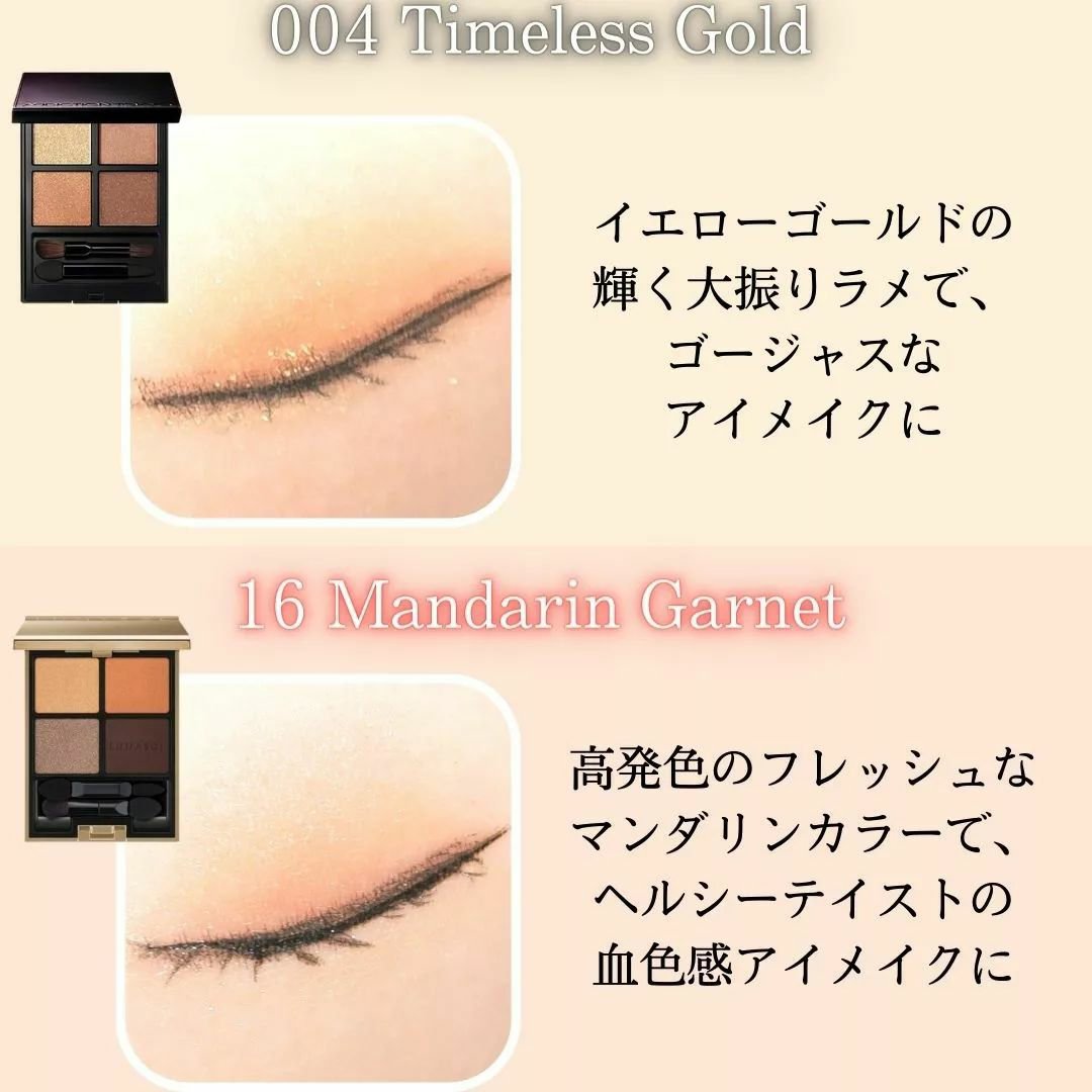 和を感じる、苺の蜜ときな粉のかき氷のような 優しさとやわらかさを組み合わせたピンクトーンのパレット 低彩度のパープルやストロベリーカラーのシャドウです。洗練された印象や神秘的な雰囲気を 演出します。 ハイトーンのオレンジ&イエローカラーのシャドウです。暖かみのある明るい色合いで、 目元にパッと華やかさや元気さを プラスしてくれます。