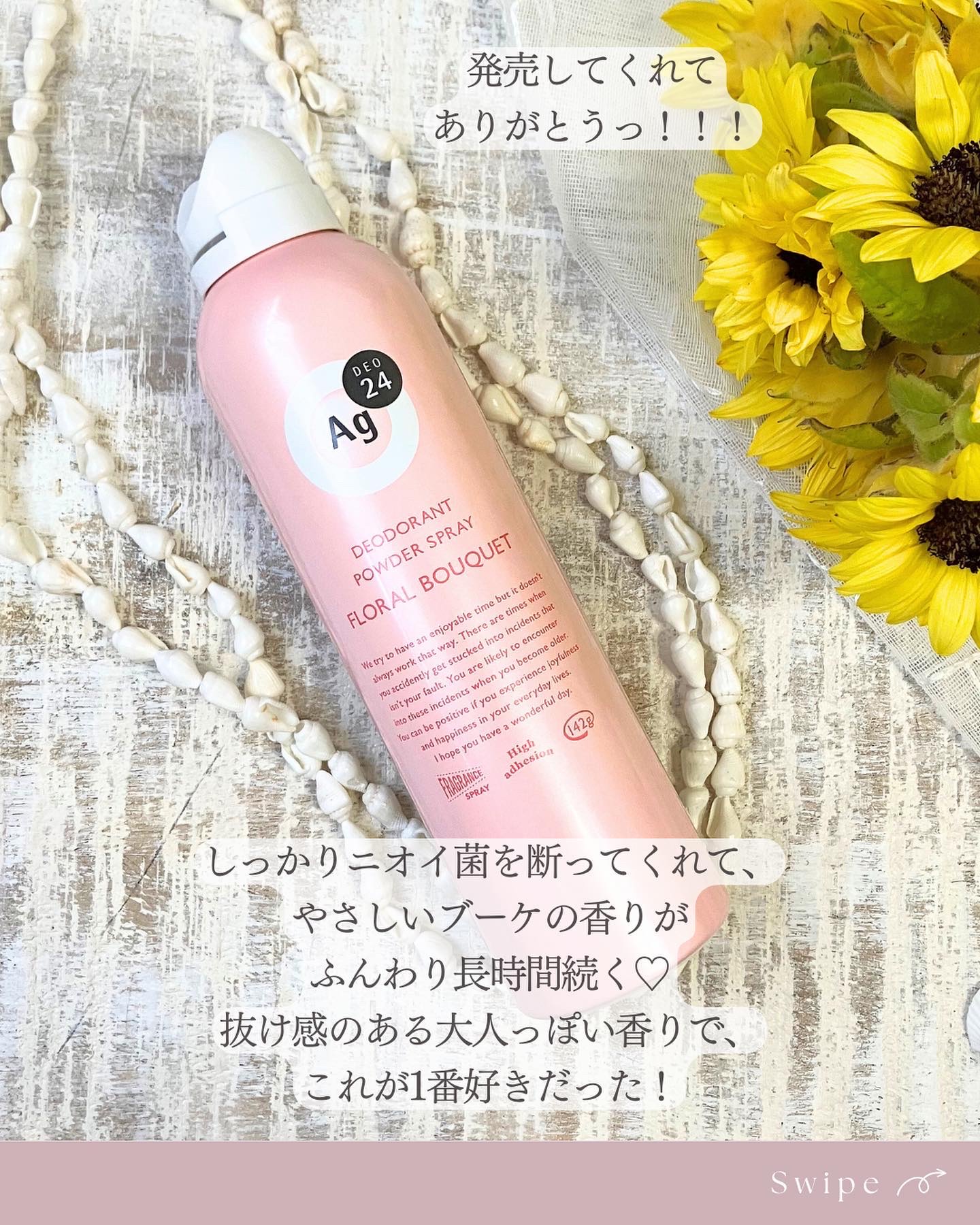大好きな香りをリピート。華やかなフローラルブーケのデオドラントスプレーAGデオ24の中で1番好きな香りかも。結局夏は毎年のようにリピートしています。※フレッシュサボンの香りレビューはこちら↓https://lipscosme.com/pos...