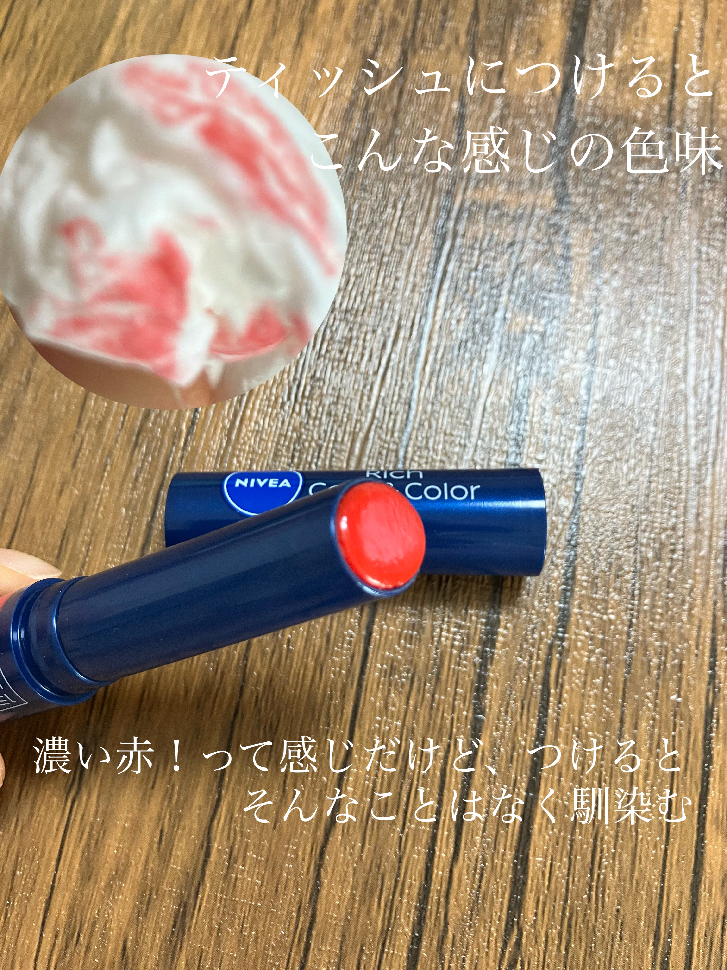 ニベアニベアリッチケア&カラーリップシアーレッド¥847いい感じのむっちり唇でほんのり色付いてこれはいい。#リップクリーム#プチプラ#カラーリップ#色付きリップ#ニベアリップクリーム...