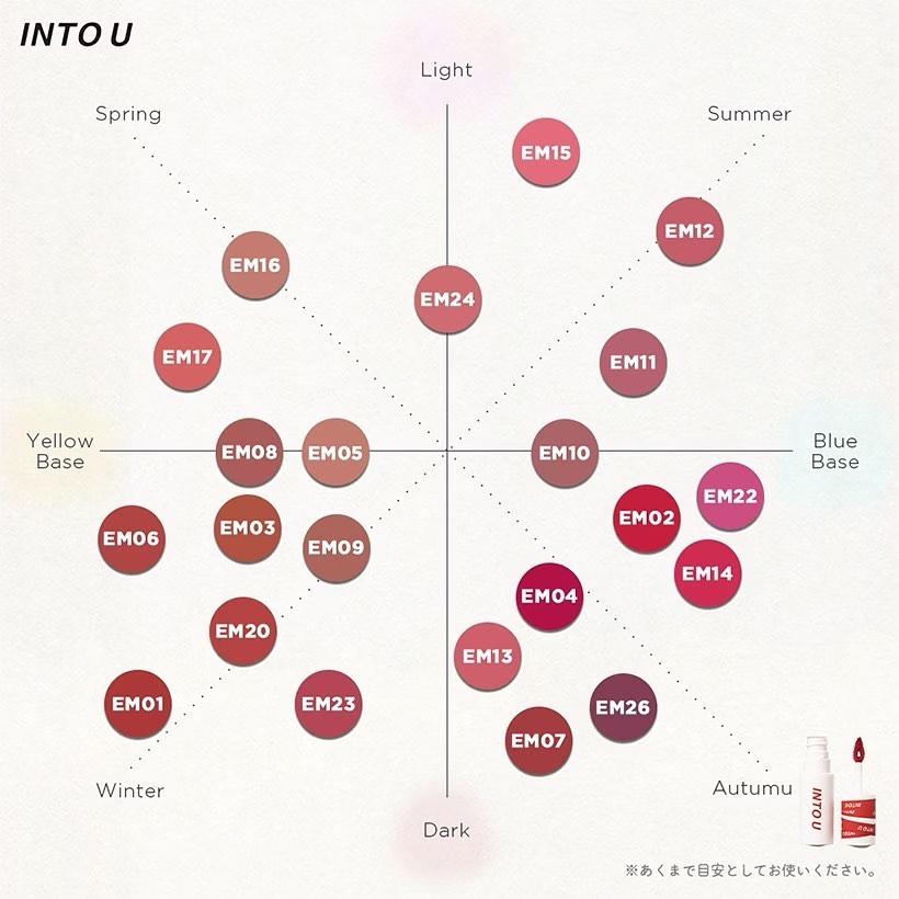 - <EM-J01 ピンクミスト> ジメチコン、ジメチコンクロスポリマー、トリベヘニン、リンゴ酸ジイソステアリル、(ビニルジメチコン/メチコンシルセスキオキサン)クロスポリマー、酸化チタン、セチルPEG/PPG-10/1ジメチコン、イソステアリン酸ソルビタン、(VP/ヘキサデセン)コポリマー、トリイソステアリン酸ポリグリセリル-2、ジイソステアリン酸ポリグリセリル-2、赤230(1)、赤202、黄4、香料、デヒドロ酢酸、酸化鉄 <EM-J02 ベルベットムード > ジメチコン、ジメチコンクロスポリマー、トリベヘニン、リンゴ酸ジイソステアリル、酸化チタン、(ビニルジメチコン/メチコンシルセスキオキサン)クロスポリマー、セチルPEG/PPG-10/1ジメチコン、イソステアリン酸ソルビタン、(VP/ヘキサデセン)コポリマー、トリイソステアリン酸ポリグリセリル-2、酸化鉄、赤202、ジイソステアリン酸ポリグリセリル-2香料、ジメチルシリル化シリカ、デヒドロ酢酸、黄4、黄5 <EM01 ポップスターブリック> ジメチコン、ジメチコンクロスポリマー、トリベヘニン、トリイソステアリン酸ポリグリセリル-2、酸化鉄、(ビニルジメチコン/メチコンシルセスキオキサン)クロスポリマー、セチルPEG/PPG-10/1ジメチコン、イソステアリン酸ソルビタン、(VP/ヘキサデセン)コポリマー、黄5、リンゴ酸ジイソステアリル、赤202、ジイソステアリン酸ポリグリセリル-2、香料、デヒドロ酢酸、水添ロジン酸メチル <EM03 モデルテラコッタ> ジメチコン、ジメチコンクロスポリマー、トリイソステアリン酸ポリグリセリル-2、トリベヘニン、黄4、酸化鉄、(ビニルジメチコン/メチコンシルセスキオキサン)クロスポリマー、セチルジメチコンコポリオール、イソステアリン酸ソルビタン、(VP/ヘキサデセン)コポリマー、リンゴ酸ジイソステアリル、香料、デヒドロ酢酸、水添ロジン酸メチル <EM05 美人シナモン> ジメチコン、ジメチコンクロスポリマー、トリベヘニン、リンゴ酸ジイソステアリル、酸化チタン、酸化鉄、トリイソステアリン酸ポリグリセリル-2、(ビニルジメチコン/メチコンシルセスキオキサン)クロスポリマー、セチルジメチコンコポリオール、イソステアリン酸ソルビタン、(VP/ヘキサデセン)コポリマー、香料、赤202、ジイソステアリン酸ポリグリセリル-2、デヒドロ酢酸、水添ロジン酸メチル <EM07 ファッショニスタココア> ジメチコン、ジメチコンクロスポリマー、トリイソステアリン酸ポリグリセリル-2、トリベヘニン、赤227、(ビニルジメチコン/メチコンシルセスキオキサン)クロスポリマー、酸化鉄、セチルジメチコンコポリオール、イソステアリン酸ソルビタン、(VP/ヘキサデセン)コポリマー、黄5、リンゴ酸ジイソステアリル、香料、デヒドロ酢酸、水添ロジン酸メチル <EM08 インフルエンサーモカ> ジメチコン、ジメチコンクロスポリマー、トリベヘニン、トリイソステアリン酸ポリグリセリル-2、(ビニルジメチコン/メチコンシルセスキオキサン)クロスポリマー、リンゴ酸ジイソステアリル、酸化鉄、酸化チタン、セチルジメチコンコポリオール、イソステアリン酸ソルビタン、(VP/ヘキサデセン)コポリマー、黄5、赤202、ジイソステアリン酸ポリグリセリル-2、香料、デヒドロ酢酸、水添ロジン酸メチル <EM09 セレブブラウン> ジメチコン、ジメチコンクロスポリマー、トリベヘニン、リンゴ酸ジイソステアリル、酸化鉄、酸化チタン、トリイソステアリン酸ポリグリセリル-2、(ビニルジメチコン/メチコンシルセスキオキサン)クロスポリマー、セチルジメチコンコポリオール、イソステアリン酸ソルビタン、(VP/ヘキサデセン)コポリマー、香料、赤202、ジイソステアリン酸ポリグリセリル-2、デヒドロ酢酸、水添ロジン酸メチル <EM10 クイーンローズティー> ジメチコン、ジメチコンクロスポリマー、トリベヘニン、トリイソステアリン酸ポリグリセリル-2、(ビニルジメチコン/メチコンシルセスキオキサン)クロスポリマー、リンゴ酸ジイソステアリル、酸化チタン、酸化鉄、セチルジメチコンコポリオール、イソステアリン酸ソルビタン、(VP/ヘキサデセン)コポリマー、赤227、香料、デヒドロ酢酸、水添ロジン酸メチル <EM11 アーティストモーヴ> ジメチコン、ジメチコンクロスポリマー、トリベヘニン、リンゴ酸ジイソステアリル、(ビニルジメチコン/メチコンシルセスキオキサン)クロスポリマー、酸化チタン、トリイソステアリン酸ポリグリセリル-2、酸化鉄、セチルジメチコンコポリオール、イソステアリン酸ソルビタン、(VP/ヘキサデセン)コポリマー、黄5、赤202、ジイソステアリン酸ポリグリセリル-2、香料、デヒドロ酢酸、水添ロジン酸メチル <EM12 高嶺の花コーラル> ジメチコン、ジメチコンクロスポリマー、トリベヘニン、リンゴ酸ジイソステアリル、酸化チタン、(ビニルジメチコン/メチコンシルセスキオキサン)クロスポリマー、トリイソステアリン酸ポリグリセリル-2、セチルジメチコンコポリオール、イソステアリン酸ソルビタン、(VP/ヘキサデセン)コポリマー、黄4
