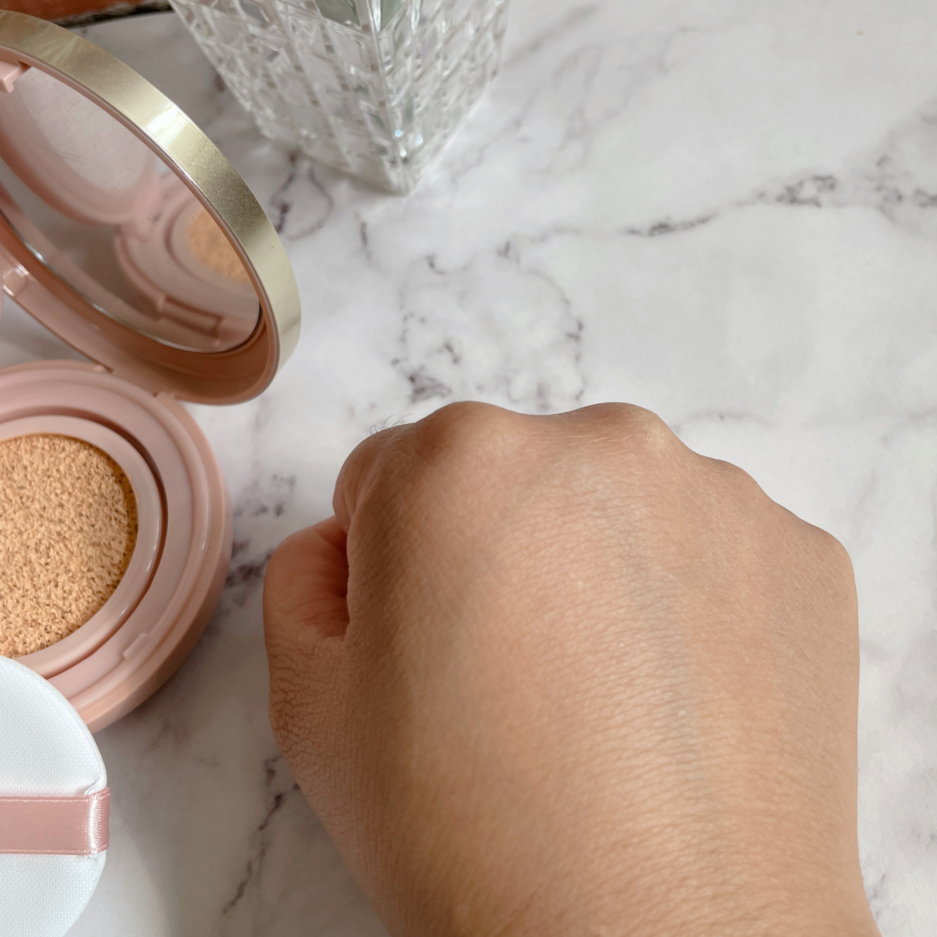 保湿力が旧品よりアップしたという美容液プライマー。4色もあるのは嬉しい。どれかヒットするはず。 スルスルなめらかに塗れる、みずみずしいテクスチャー。00はザ・ピンクの下地。内側から発光するような明るさ。 香りはシースルー ヴェール コンパクトと同じ素敵な香りがしました。このクッションファンデ、薄づきなんですが仕上がりがすごくいい感じなのですよ。