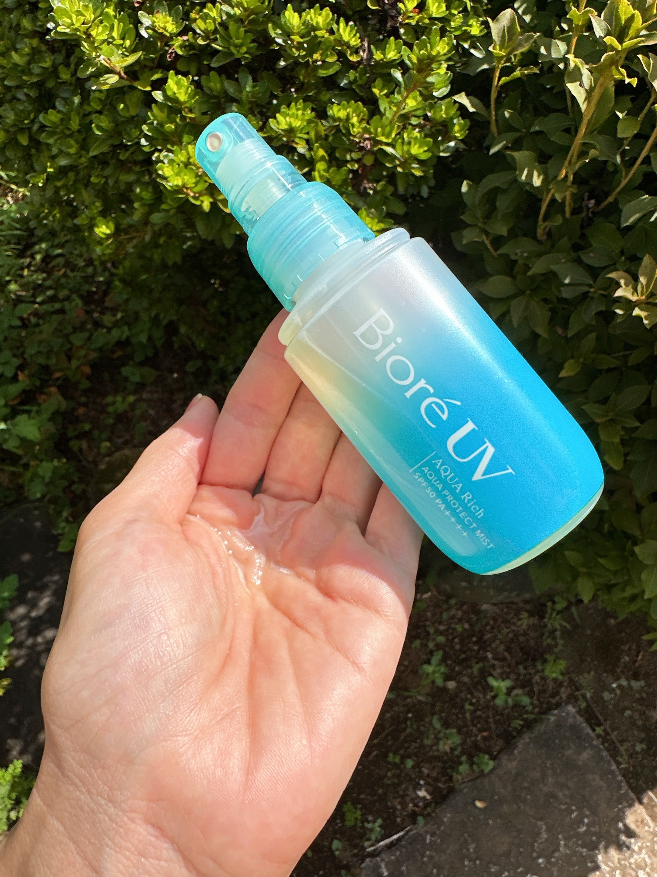 ビオレUVアクアリッチアクアプロテクトミストミストタイプの日焼け止め☀️髪にも使えるし、首や膝裏など塗りにくいところにも使いやすいです♪外出先での塗り直しにも便利!ガスタイプのスプレー缶だと、夏場に暑い中持ち歩くのも怖いし、公共のお手洗いで使...