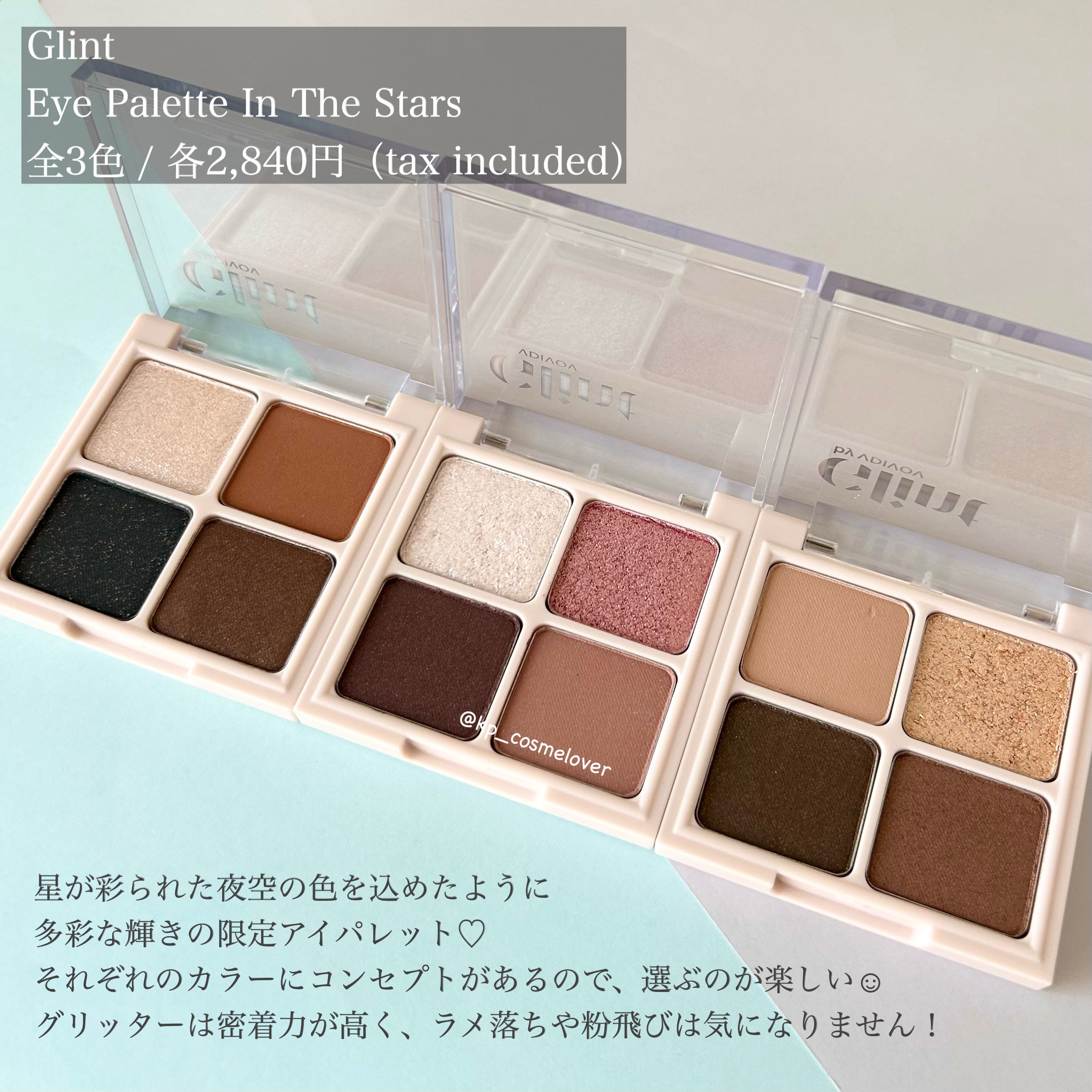 - 誰もが眩しく輝くように、世界のすべての光を閉じ込めたグリントのアイシャドウパレッド。星が彩られた夜空の色をそのまま閉じ込めた多彩な輝きを眼差しに。数えきれない星のように角度によって多彩に輝くパール粒子と深みのあるカラーで夜空に輝く星のムードを表現しましょう。日常のさりげない瞬間に輝きを残すグリッターは塗った瞬間にスムーズに密着、星が昇ったようなキラキラな目元を長時間キープ。