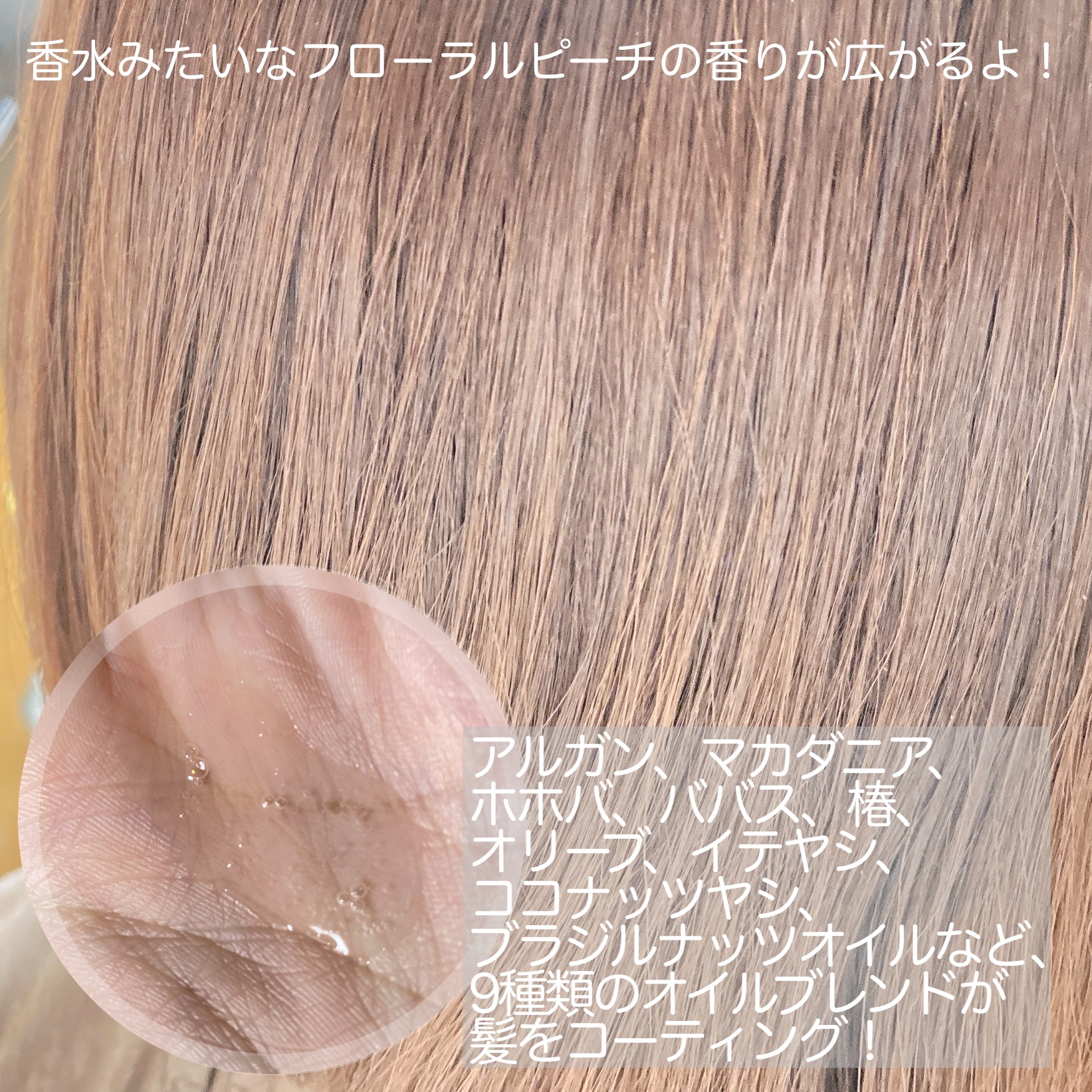 - 自然由来のオイル配合で、髪のダメージを補修&潤いを与える軽い付け心地のヘアセラム。 フローラルピーチの香り。
