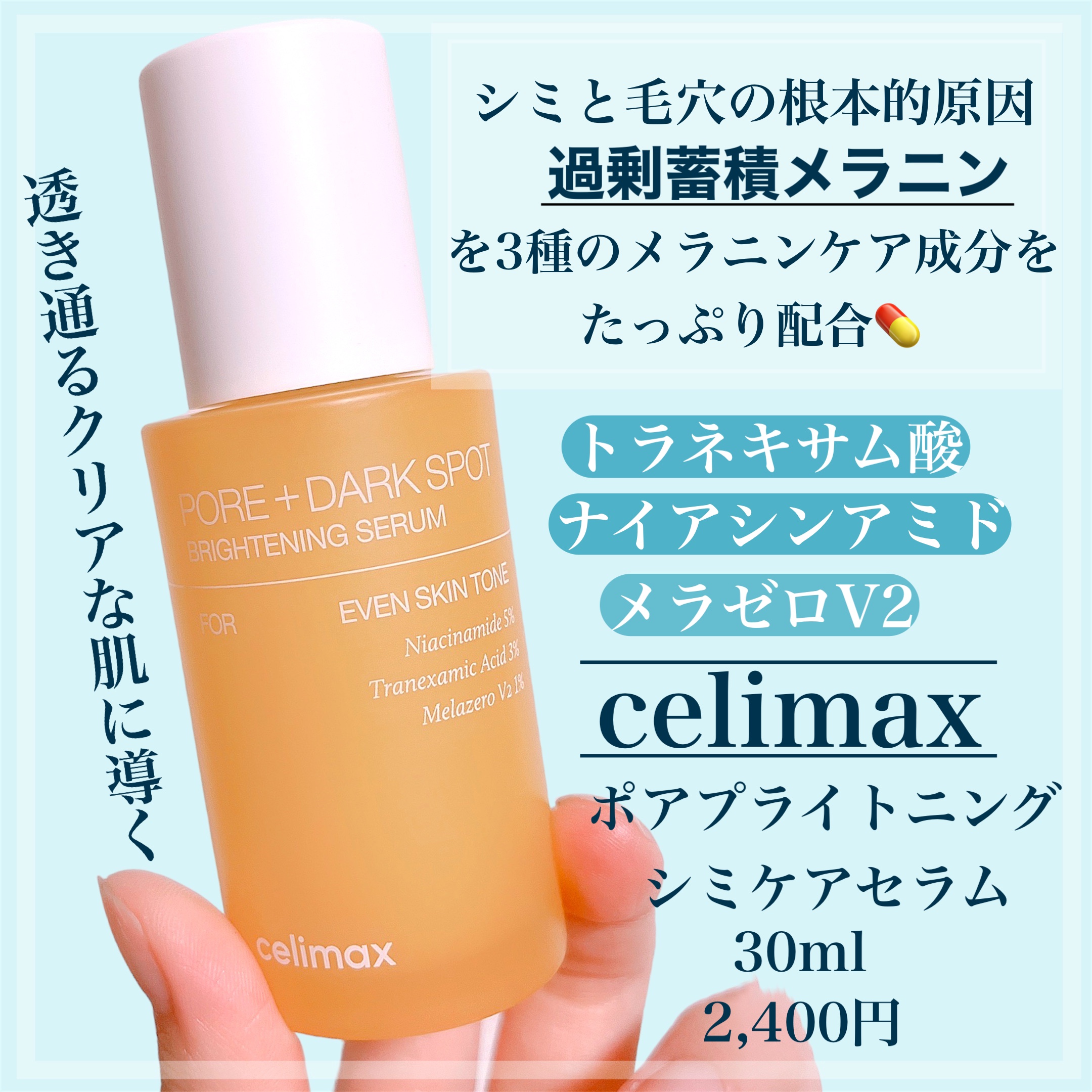 毛穴・シミ・くすみ・色素沈着が気になる方にオススメ‼️celimax💎ポアブライトニングシミケアセラム💎ポアブライトニングシミケアクリームセラムはトラネキサム酸、約3%メラニン生成の過剰を抑え、黒ずみや色素沈着(肝斑など)にアプローチ!ナイア...