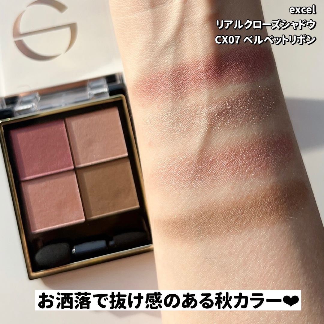 CX03パフスリーブとCX07ベルベットリボンは、全くタイプの違う、淡めブルベと濃いめ秋冬 Excelの粉質が好きで買いました💕 しっとりめの粉質で、リアルクローズシャドウは、カラーメイク中心のシャドウです👀💄💖 結局プチプラで粉質のいい王道Excelに戻ってきてしまう……😭✨️