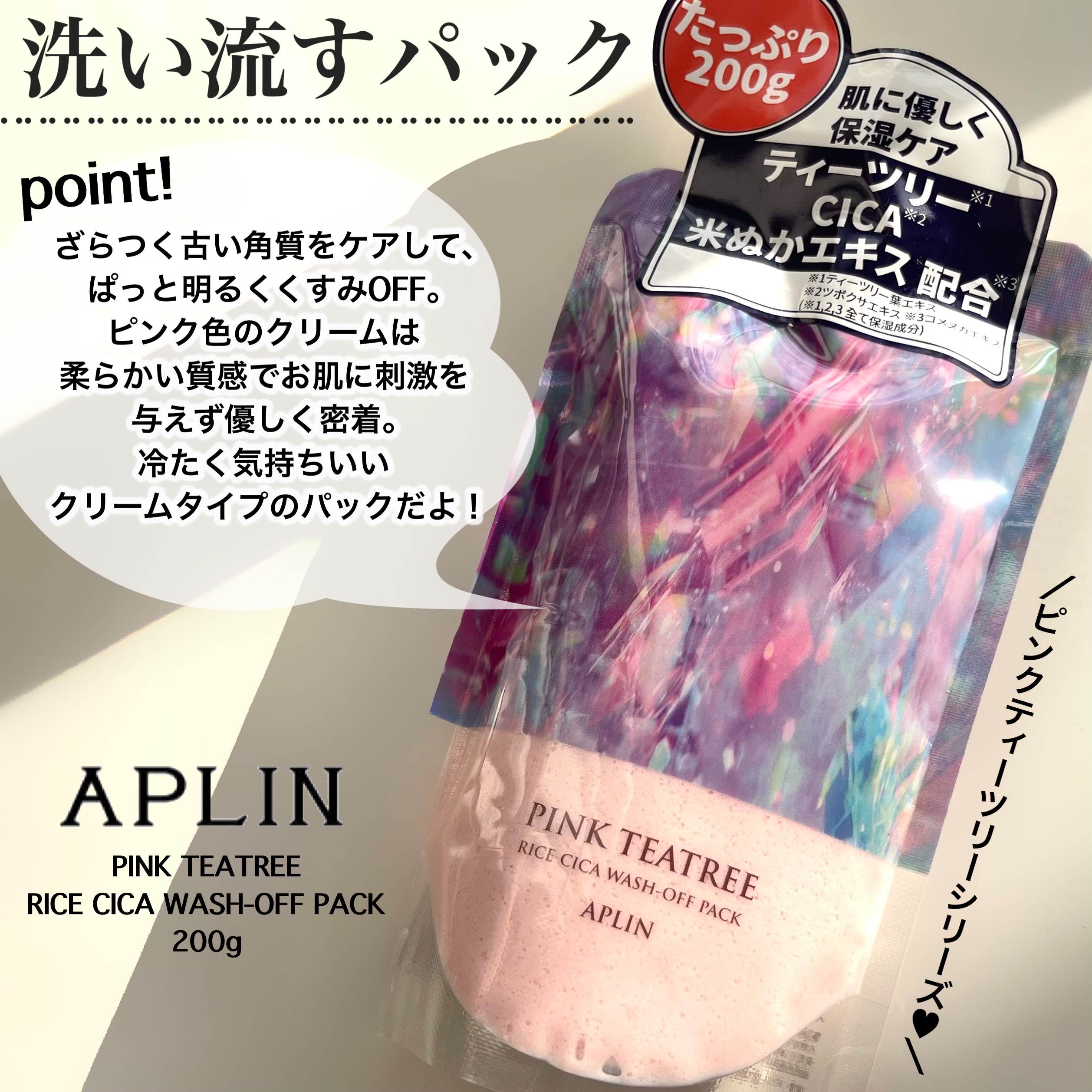 今日のパックは大好きアプリンの💕APLINピンクティーツリーライスシカウォッシュオフパックザラつく古い角質をケアしてパッと明るくくすみOFFしてくれる。クリームタイプでピンクティーツリーシリーズ使ってる人は分かると思うけどあのいい香りをまとえ...
