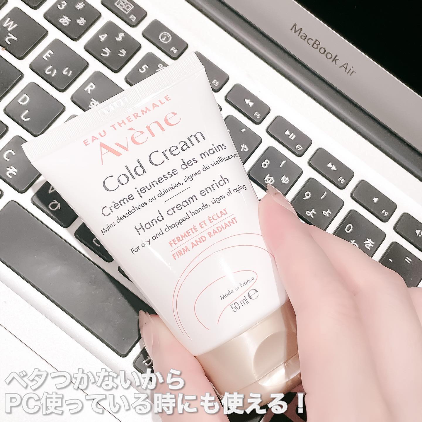 - アベンヌコールドクリーム成分配合で、保湿効果の高いクリームです。乾燥や外部刺激からしっかりまもり、使うほどあれにくい手肌に導きます。 なめらかに伸びて、ベタつかないから、スマホも、仕事も、水仕事もすぐOKです