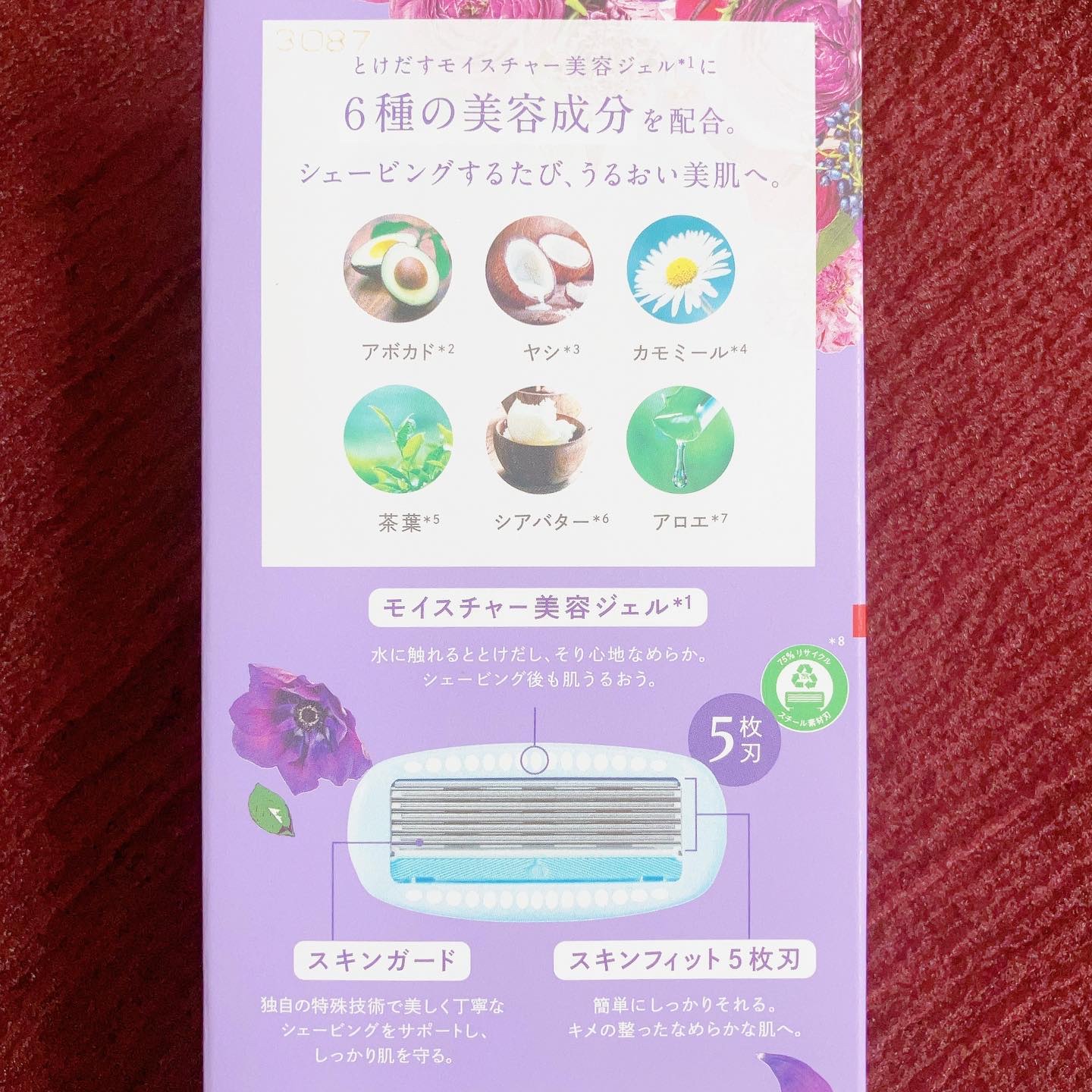 5枚の歯がすっきり毛を剃ってくれること、それでいてカミソリ負けを起こさないことがお気に入りポイントです。 とけだすうるおい美容ジェル(水に触れるとモイスチャーソリッド(シェービング剤)が溶け出しジェルになります)ってところがすごいですよね。 ぽてん、ぷるんとしたテクスチャーで、カミソリ滑りが滑らかになります。