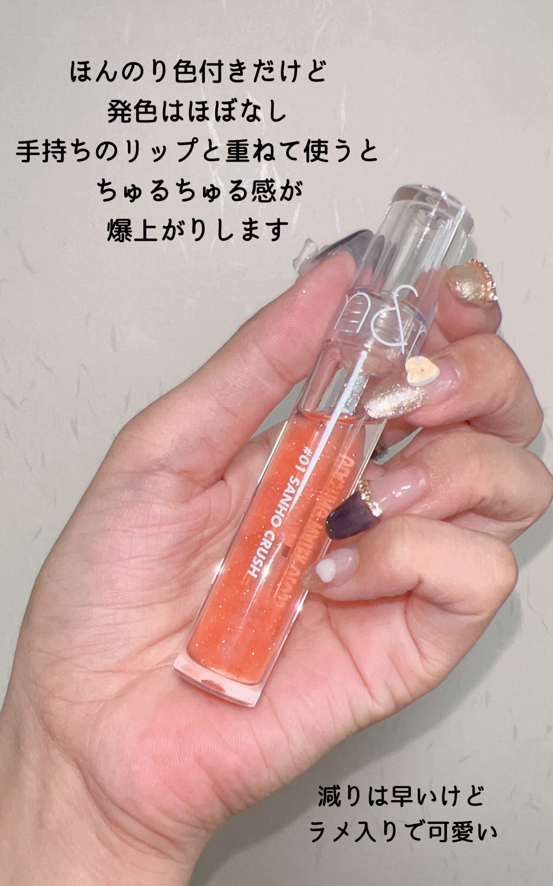 - さざ波にゆらゆら、きらめく光のように ①唇を包み込む透明で玲瓏な#ウォーター・カバー・グロス ②どんなリップと組み合わせてもきれいになる#ツヤ光沢 ③さざ波の陽光を取り入れたように#ユンスル・グリッター