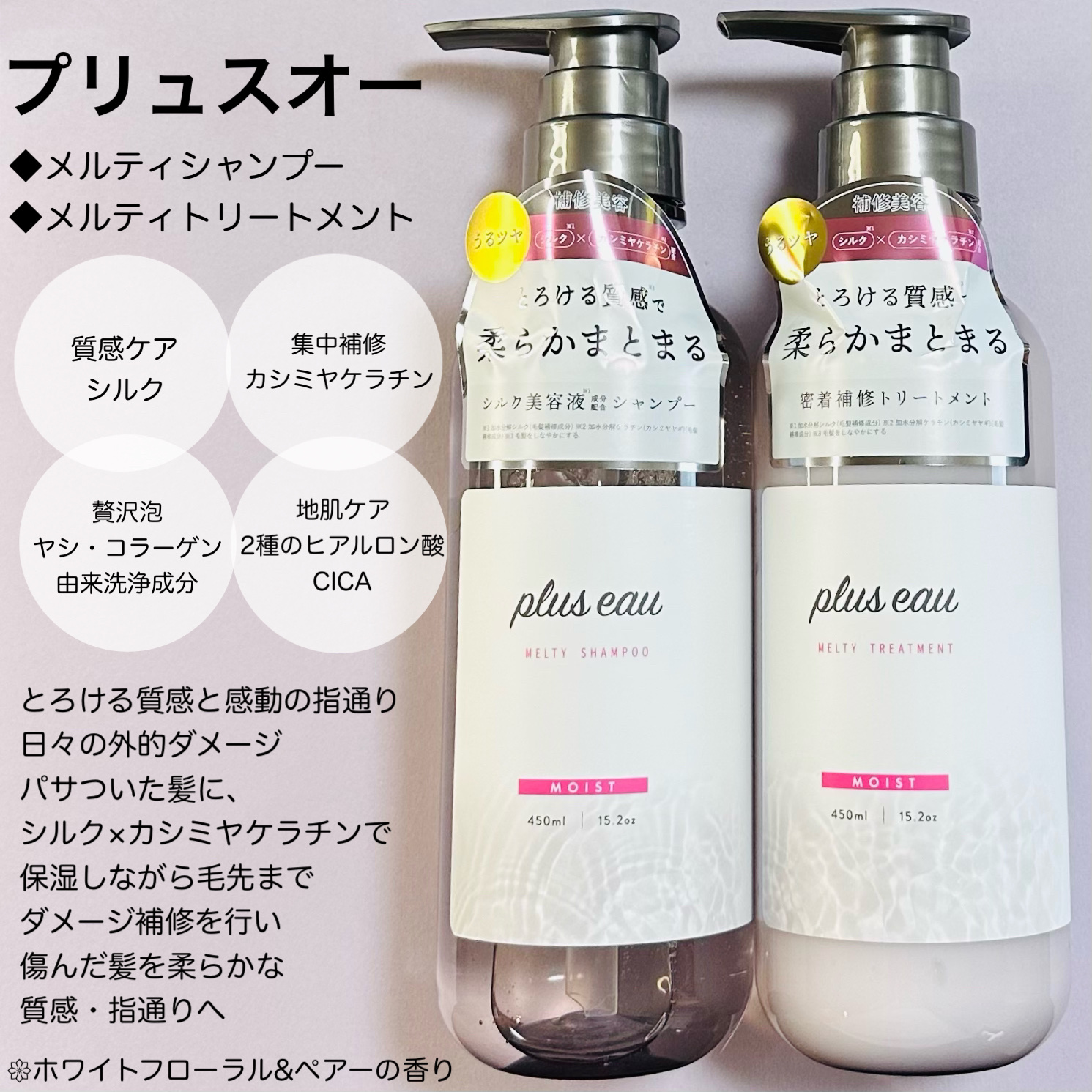 - とろけるような質感と、うねり・広がりやすい髪も毛先まで柔らかにスルンとまとまるツヤ髪へ導く美容液シャンプー&浸透補修トリートメント。 洗いながらも髪ダメージを補修するコラーゲン由来とケラチン由来の2種のPPT系洗浄成分、肌のことを考えてアミノ酸系の3種の洗浄成分をバランスよくブレンド。 キメ細かな濃密補修泡が摩擦レスでリッチな洗い心地を実現し、髪と頭皮をいたわりながらシャンプーでも毛髪ダメージに徹底アプローチします。 カシミヤ由来のケラチンをはじめとする3種のケラチン、シルクPPT&コラーゲンPPT、CMC類似成分などのこだわり配合した補修成分だけでなく、美容保湿成分をたっぷり浸透させて密封補修することで、カラーや熱ダメージによるパサつき・広がり・ゴワつきなどの蓄積ダメージもしっかりケア。 また、浸透性が高く毛髪内部から水分の蒸発を防ぐナノセラミドをメルティシリーズに新配合。 ペタンと重くならないのに毛先が柔らかにまとまってツヤめく髪へと導きます。 ドライヤーやヘアアイロンの熱ダメージから髪を守りツヤを与える、ヒートリペア成分を配合して熱も味方に。 清楚な上品さを纏うホワイトフローラル&ペア―の香り。 2023/8/10 一部企業にて先行発売