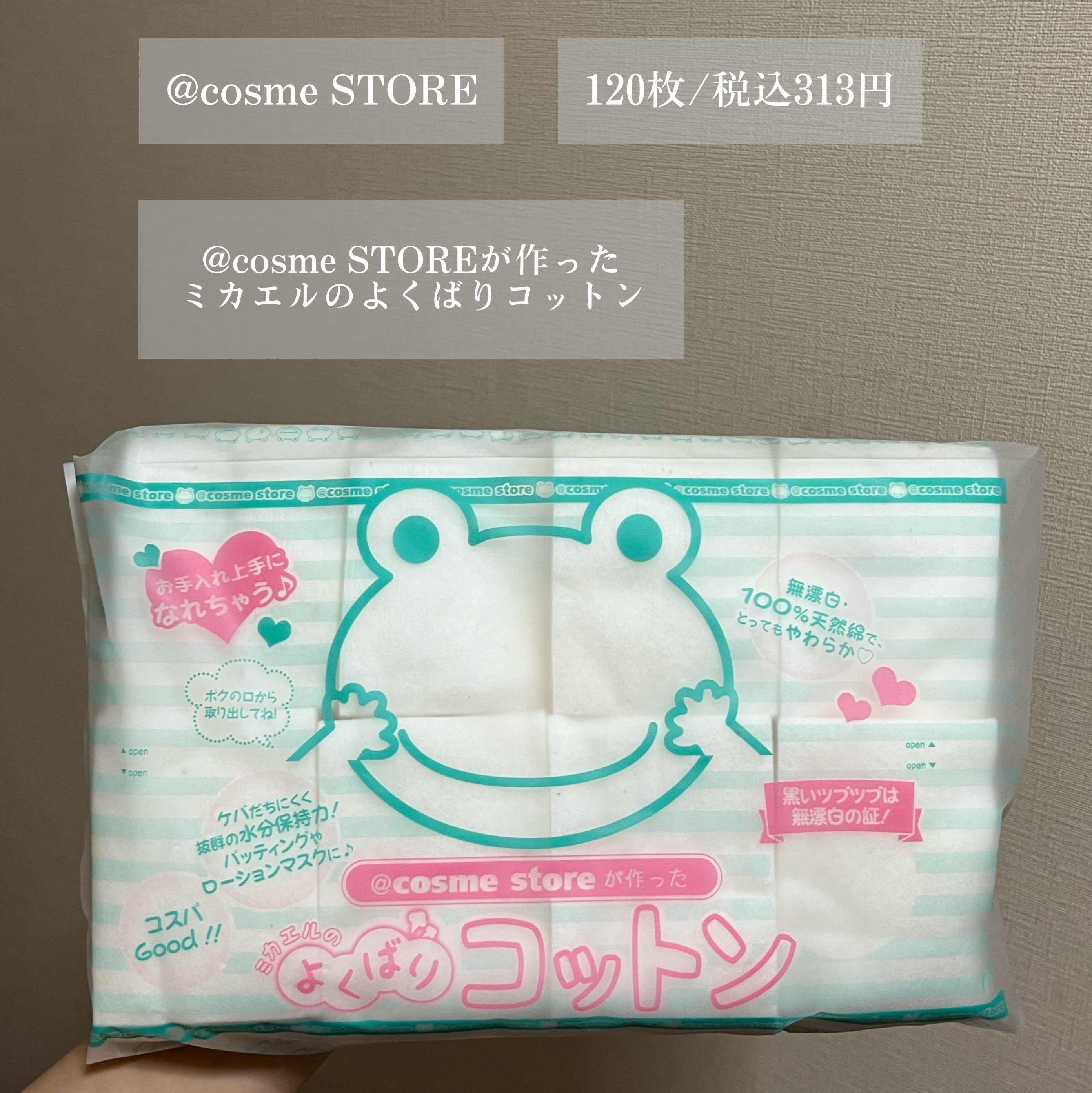 ▽@cosmestoreが作ったミカエルのよくばりコットン大きさと厚さに満足です。毛羽たたずに使えます。無漂白・100%天然綿のふわふわコットンで、120枚入っています。パケも可愛く、コスメ購入の予算の金額合わせにもできて、オススメです!#夏...