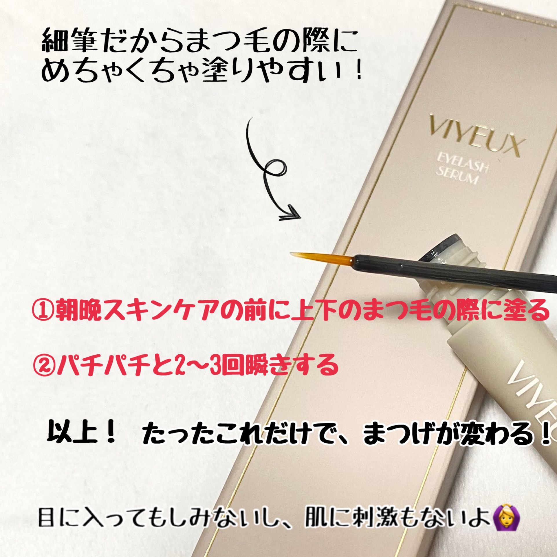 長さ・太さ・密度・ハリ悩みに色素沈着しない安心して使用できる商品! この美容液の嬉しい点は色素沈着の原因とも言われているプロスタグランジン系の成分が配合されていないんです。 筆先が細くコシがあるので、先だけでまつ毛の際を塗りやすいです! 美容液を塗布したら3回ほど瞬きをすると万遍なく浸透します🩷 使い始めて2週間経過していますが使いやすさはもちろんまつ毛がしっかりしてきているように感じています☺️