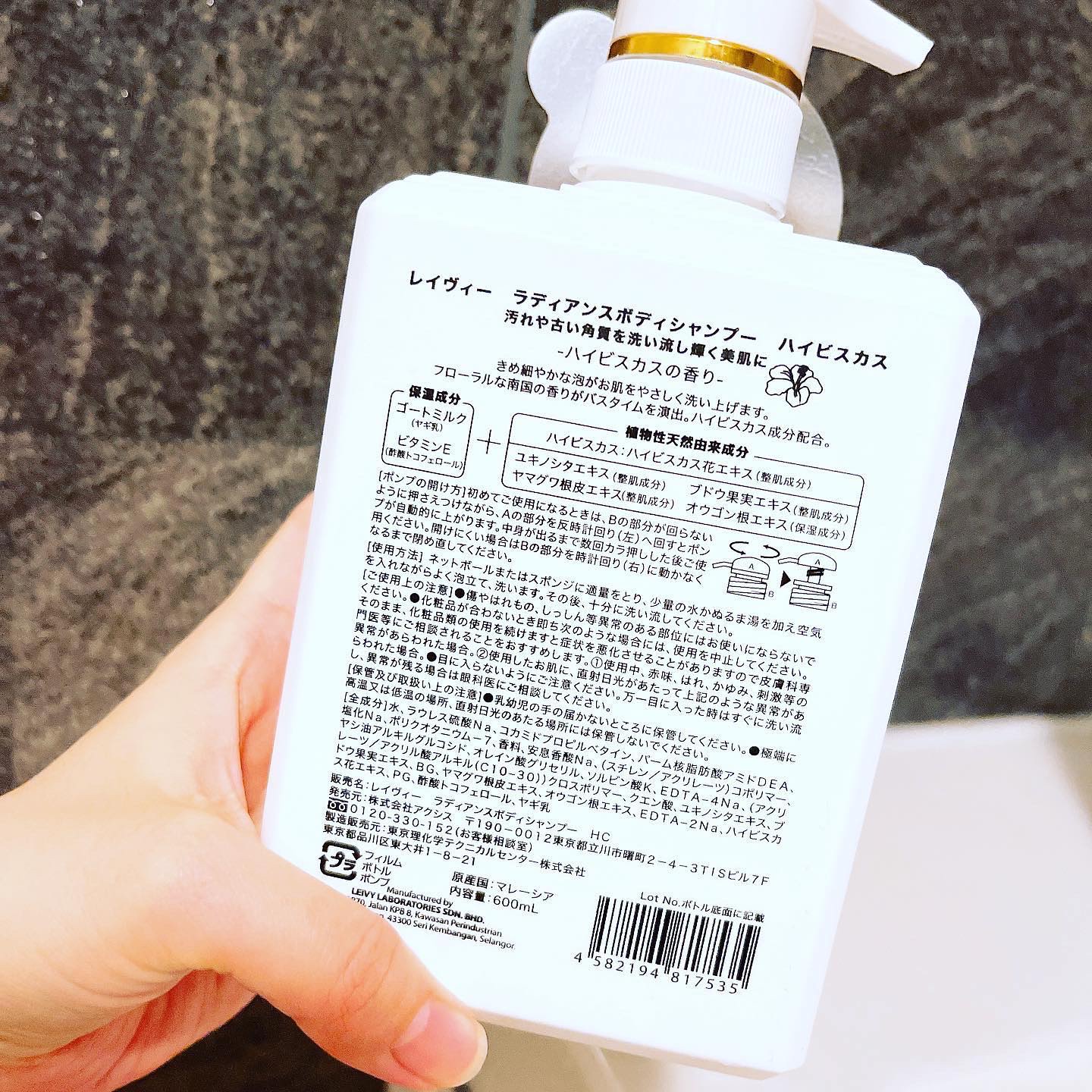 美肌に導く、4つの植物性天然由来成分 レイヴィーならではのゴートミルク(ヤギ乳)とビタミンEでより美肌に 肌により安心なソープフリー&弱酸性 ハイビスカスの香りです🌺 強すぎないフローラルの香りで、洗い上がりもほのかに香ります✨ とろとろとしたテクスチャーのボディシャンプーで、柔らかい泡立ちなので優しい使い心地です。 お肌がしっとりに感じる使い心地です♡