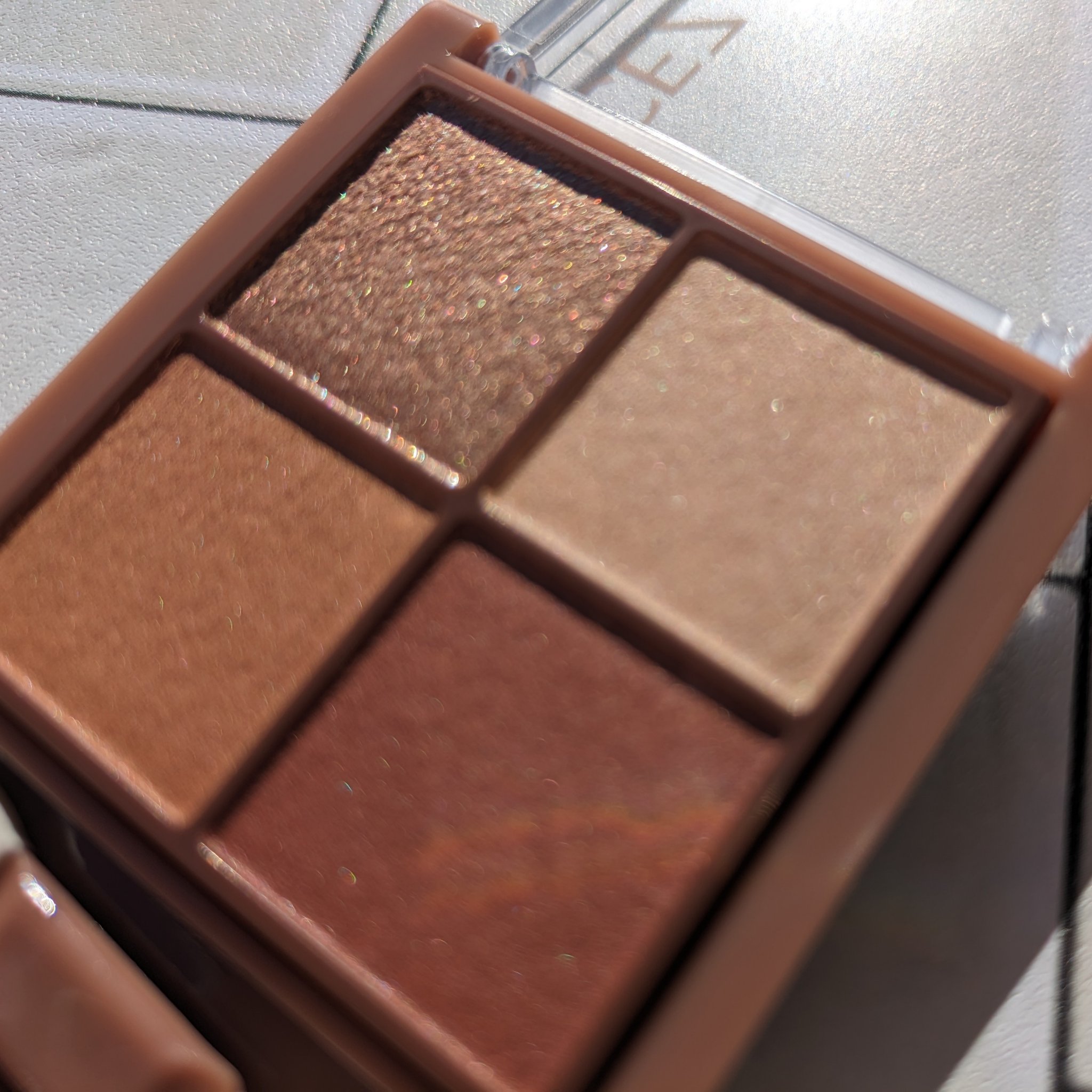 - 透け感マット×濃厚ブラウンの4色アイシャドウ。 しっかり目元を引き締めるビターなブラウンカラー。 透け感のあるブラウンを重ねて、自然な陰影のある目元へ。 ふんわり柔らかなパウダーなので、スルスル伸びてまぶたにピタッと密着。 保湿成分(スクワラン、ホホバ種子油)配合。