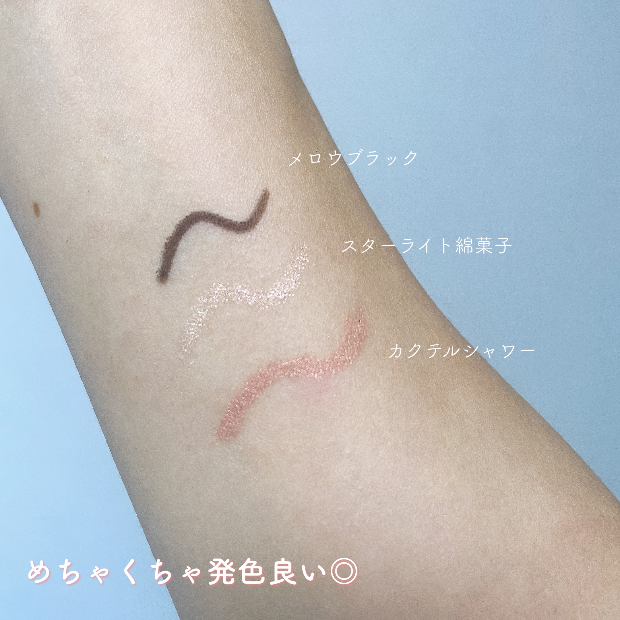 落ちにくく、滲みにくいです✏️密着も良く、するする描きやすかったです💗 ミルクブラウンは陰影にも⭕️ムーンライトオーロラ、スターライト綿菓子は涙袋にも可愛いです🥰 気になる方は是非チェックしてみてね🐰