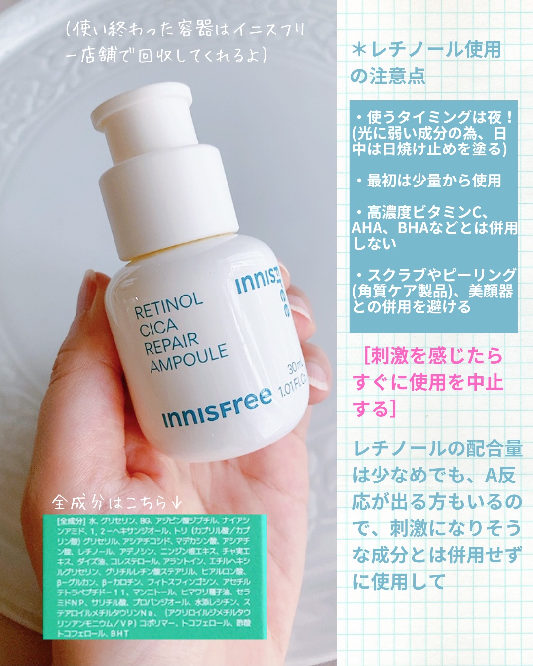 - <【旧】50mL> 水、グリセリン、BG、アジピン酸ジブチル、ナイアシンアミド、1,2-ヘキサンジオール、トリ(カプリル酸/カプリン酸)グリセリル、アシアチコシド、マデカシン酸、アシアチン酸、レチノール、アデノシン、ニンジン根エキス、チャ実エキス、ダイズ油、コレステロール、アラントイン、エチルヘキシルグリセリン、グリチルレチン酸ステアリル、ヒアルロン酸、β-グルカン、β-カロチン、フィトスフィンゴシン、アセチルテトラペプチド-11、マンニトール、ヒマワリ種子油、セラミドNP、サリチル酸、プロパンジオール、水添レシチン、ステアロイルメチルタウリンNa、(アクリロイルジメチルタウリンアンモニウム/VP)コポリマー、トコフェロール、酢酸トコフェロール、BHT <【旧】30mL> 水、グリセリン、BG、アジピン酸ジブチル、ナイアシンアミド、1,2-ヘキサンジオール、トリ(カプリル酸/カプリン酸)グリセリル、アシアチコシド、マデカシン酸、アシアチン酸、レチノール、アデノシン、ニンジン根エキス、チャ実エキス、ダイズ油、コレステロール、アラントイン、エチルヘキシルグリセリン、グリチルレチン酸ステアリル、ヒアルロン酸、β-グルカン、β-カロチン、フィトスフィンゴシン、アセチルテトラペプチド-11、マンニトール、ヒマワリ種子油、セラミドNP、サリチル酸、プロパンジオール、水添レシチン、ステアロイルメチルタウリンNa、(アクリロイルジメチルタウリンアンモニウム/VP)コポリマー、トコフェロール、酢酸トコフェロール、BHT <本体30mL> 水、グリセリン、BG、アジピン酸ジブチル、ナイアシンアミド、1,2-ヘキサンジオール、トリ(カプリル酸/カプリン酸)グリセリル、アシアチコシド、マデカシン酸、アシアチン酸、レチノール、アデノシン、ニンジン根エキス、チャ実エキス、ダイズ油、コレステロール、アラントイン、エチルヘキシルグリセリン、グリチルレチン酸ステアリル、ヒアルロン酸、β-グルカン、β-カロチン、フィトスフィンゴシン、アセチルテトラペプチド-11、マンニトール、ヒマワリ種子油、セラミドNP、サリチル酸、プロパンジオール、水添レシチン、ステアロイルメチルタウリンNa、(アクリロイルジメチルタウリンアンモニウム/VP)コポリマー、トコフェロール、酢酸トコフェロール、BHT <レチノール シカ × サンケア セット> 水、BG、グリセリン、トコフェロール、アジピン酸ジブチル、プロパンジオール、エチルヘキシルグリセリン、ヒアルロン酸、水添レシチン、セラミドNP、ダイズ油、コレステロール、フィトスフィンゴシン、マンニトール、酢酸トコフェロール、ニンジン根エキス、レチノール、グリチルレチン酸ステアリル、アラントイン、ヒマワリ種子油、(アクリロイルジメチルタウリンアンモニウム/VP)コポリマー、トリ(カプリル酸/カプリン酸)グリセリル、BHT、アセチルテトラペプチド-11、ナイアシンアミド、サリチル酸、ステアロイルメチルタウリンNa、β-カロチン、アデノシン、β-グルカン、アシアチコシド、マデカシン酸、アシアチン酸、チャ実エキス、1,2-ヘキサンジオール <Steven Harrington × INNISFREEセット> 水、BG、グリセリン、トコフェロール、アジピン酸ジブチル、プロパンジオール、エチルヘキシルグリセリン、ヒアルロン酸、水添レシチン、セラミドNP、ダイズ油、コレステロール、フィトスフィンゴシン、マンニトール、酢酸トコフェロール、ニンジン根エキス、レチノール、グリチルレチン酸ステアリル、アラントイン、ヒマワリ種子油、(アクリロイルジメチルタウリンアンモニウム/VP)コポリマー、トリ(カプリル酸/カプリン酸)グリセリル、BHT、アセチルテトラペプチド-11、ナイアシンアミド、サリチル酸、ステアロイルメチルタウリンNa、β-カロチン、アデノシン、β-グルカン、アシアチコシド、マデカシン酸、アシアチン酸、チャ実エキス、1,2-ヘキサンジオール <ホリデー レチノール シカ リペア セラム スペシャルセット> 水、グリセリン、BG、アジピン酸ジブチル、ナイアシンアミド、1,2-ヘキサンジオール、トリ(カプリル酸/カプリン酸)グリセリル、アシアチコシド、マデカシン酸、アシアチン酸、レチノール、アデノシン、ニンジン根エキス、チャ実エキス、ダイズ油、コレステロール、アラントイン、エチルヘキシルグリセリン、グリチルレチン酸ステアリル、ヒアルロン酸、β-グルカン、β-カロチン、フィトスフィンゴシン、アセチルテトラペプチド-11、マンニトール、ヒマワリ種子油、セラミドNP、サリチル酸、プロパンジオール、水添レシチン、ステアロイルメチルタウリンNa、(アクリロイルジメチルタウリンアンモニウム/VP)コポリマー、トコフェロール、酢酸トコフェロール、BHT
