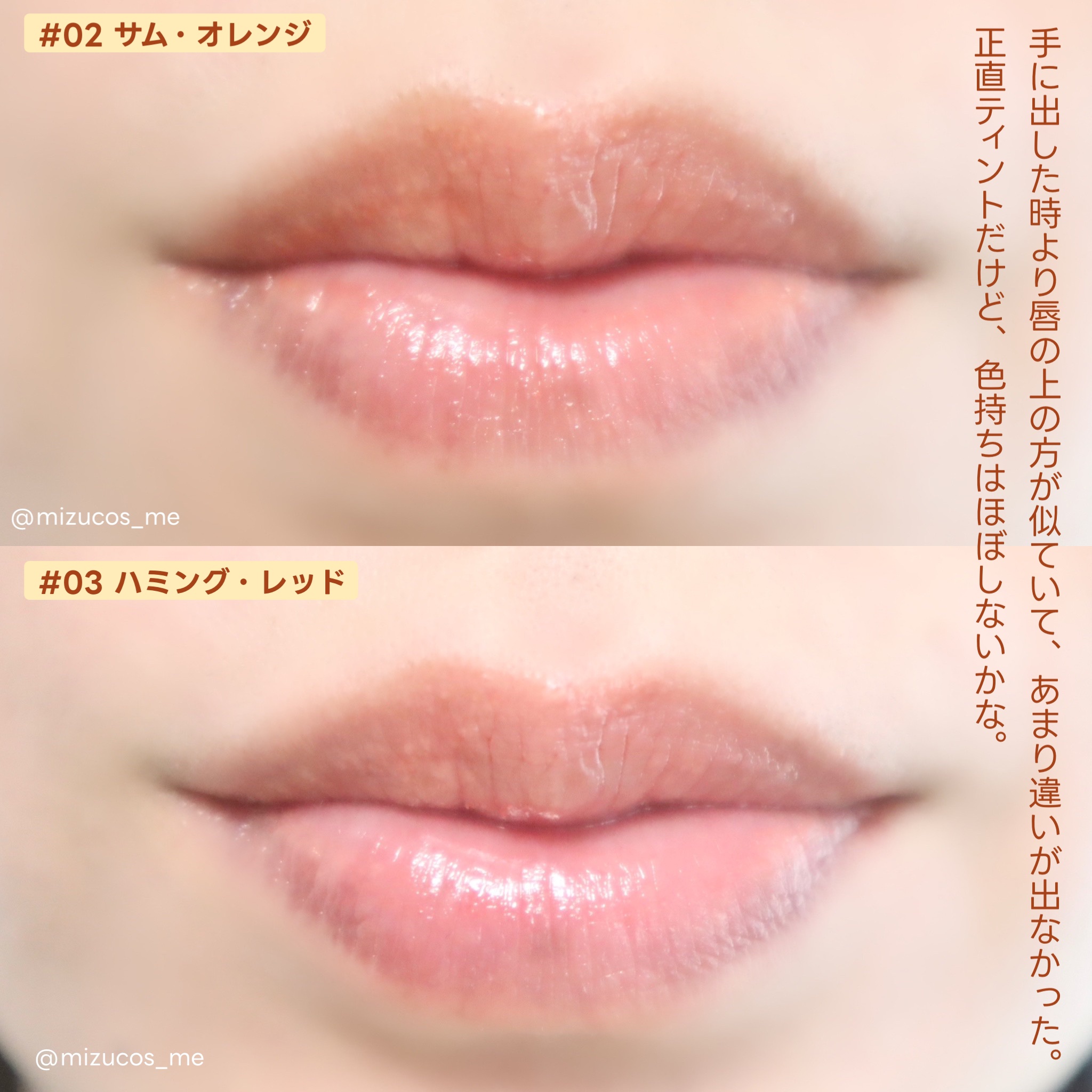 結論、なんでバズってないのか 私には理解できないくらいに良い🙆♀️ まず見た目が大優勝ね🏅 飴ちゃんみたいに透き通った色が めちゃくちゃ綺麗じゃない?? ずっと見てられる✨✨ もちろんリップとしての性能も優秀🏆 個人的にめっちゃ好きな ヒンスのムードインハンサーウォーターリキッドグロウ のむちっとした質感と LaKaのフルーティーグラムティントの 透け艶な感じを合わせた感じ!! 色もどれも可愛くて、私はイエベなので 青みが少ない色を選んだけど 全部で8色あるよ!!! 一番お気に入りは 002 サマーアプリコット🍑 まじで可愛い色だから使ってみて欲しい!!