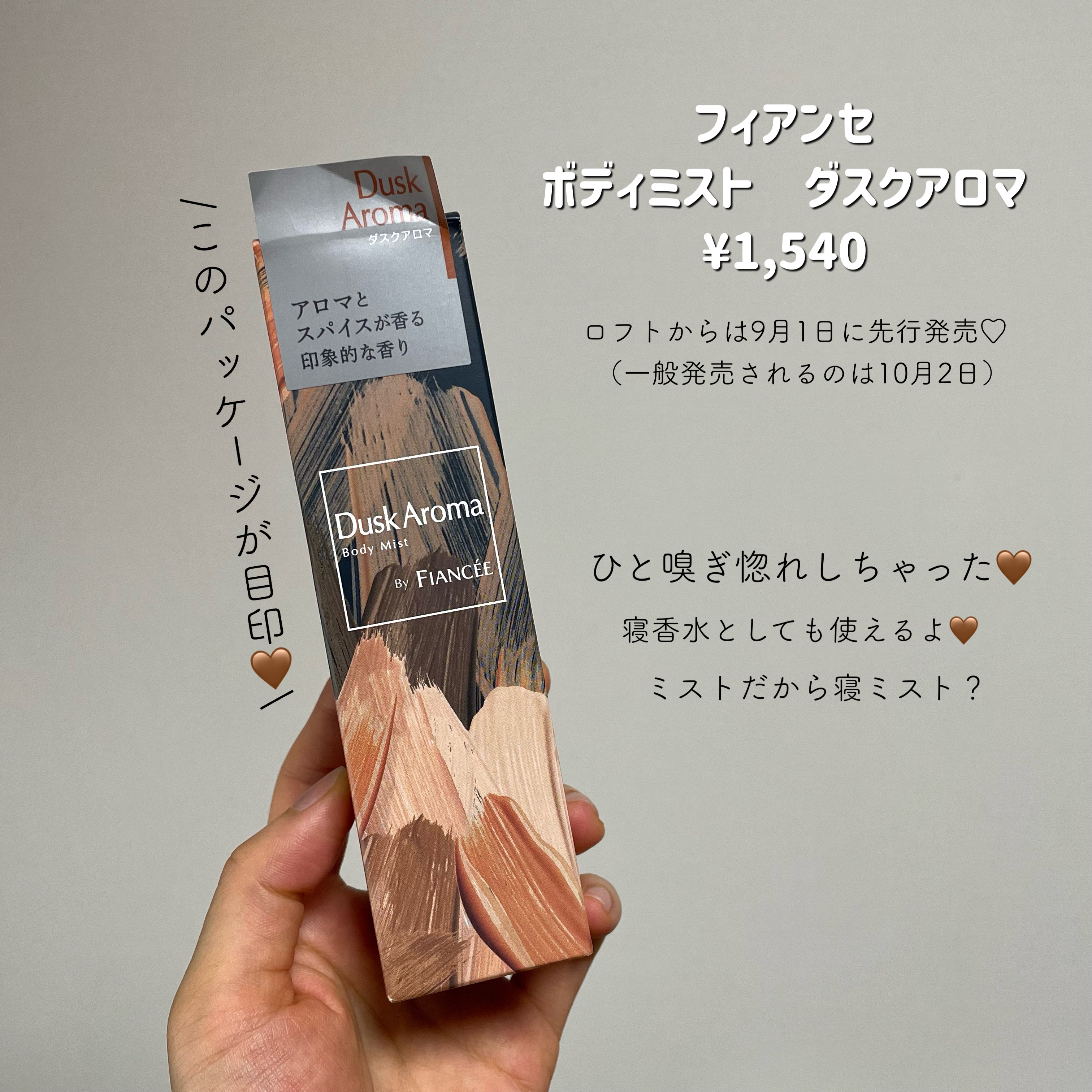 高級感ある香りにオドロキ テスター試した時にびっくりしました。某ブランドに似てるという口コミも見つけましたが、それぐらい高級感ある。 ミストでも香りの持続時間が比較的長いと感じた 香水ほど強いのは嫌だけど、ほとんど香りがしないのも嫌だ! 冬に向けてぴったりの香りなので、「フィアンセって若い子向けじゃない?」って思ってる人にぜひ試してほしい♡