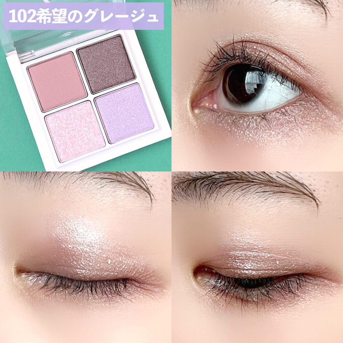 このマットタイプはマット3色とラメ1色の4色構成のアイパレット🎨 マット質感なんだけど重ね塗りしても重たくならず、むしろ透け感のあるツヤ感が出るの!! ほんのりツヤも感じる仕上がりになるので、マット系のアイシャドウが苦手な方でも使いやすい☺️ 粉質がしっとりしているので、粉飛びせずしっかりと肌に密着してくれるしさらっとした軽いつけ心地♡ 今回の新色チュチュバレリーナは甘さ控えめのピンクグレージュカラー!! 全体的に青み感のあるくすみカラーなのでブルベさんやくすみカラーが好きな方は絶対好きだと思う!! M06リマグレージュと比較するとチュチュバレリーナの方が青み強めで、程よく甘く儚い印象に仕上がるのが可愛い♡♡ 左上のシルバーラメが繊細でチラチラ輝いて最高に可愛いんよ…!! こちらの新色は2023年12月下旬よりイオンにて先行発売中、2024年1月下旬より全国発売、2024年4月頃定番化予定です!!