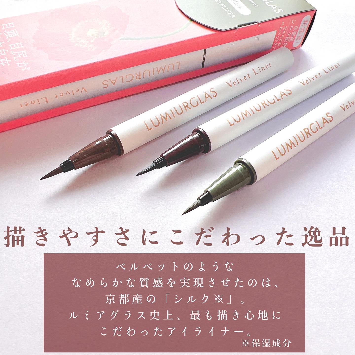 ルミアグラスさまからいただきました𓂃𓈒𓏸𑁍⋆⋆商品特徴▷▶ルミアグラス史上最も描き心地にこだわった「ベルベットアイライナー」。京都産シルク※配合でなめらかに肌になじむから、目頭から目尻までスルッとラインが描けちゃいます。乾きが早く長時間にじみ...