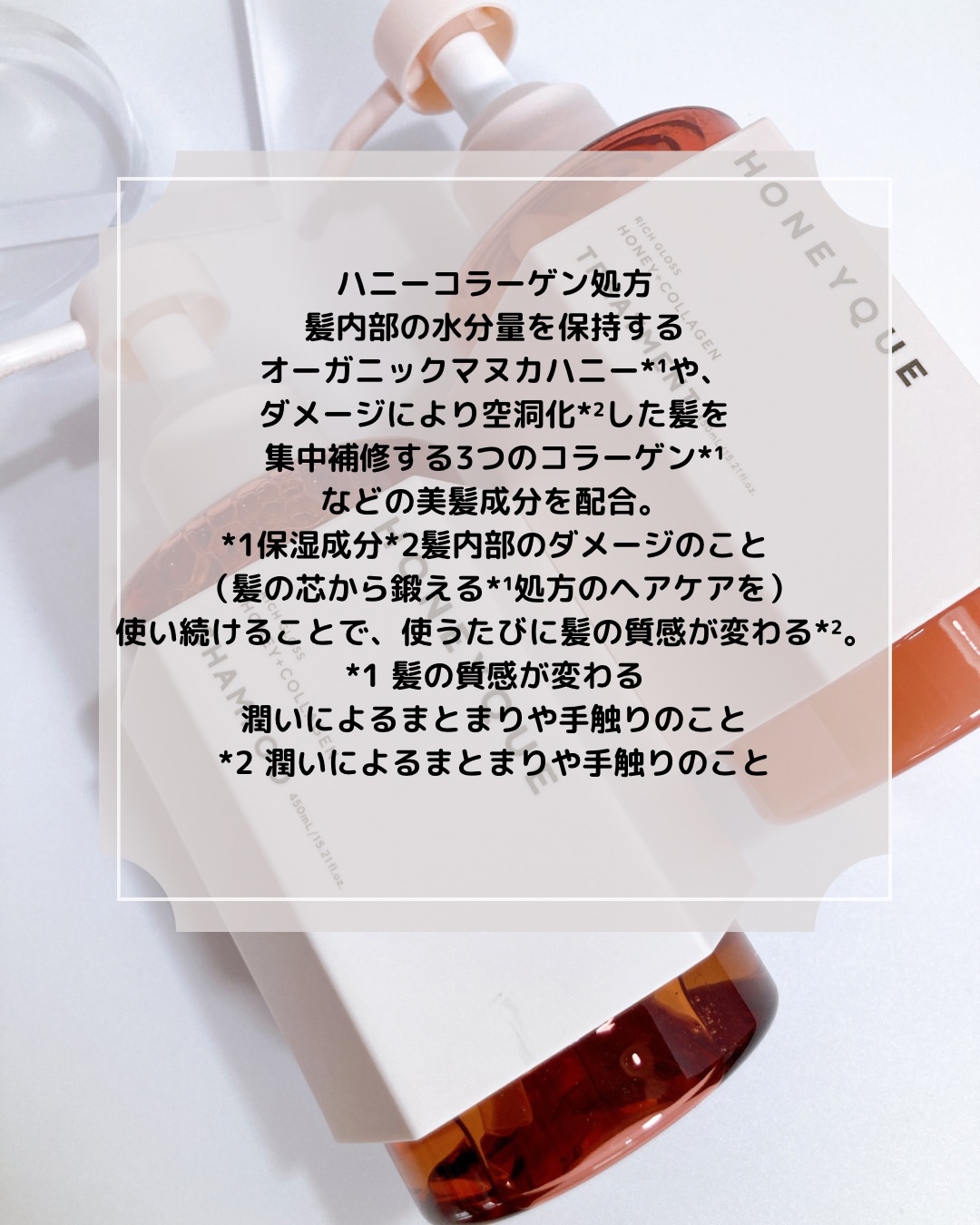 - ふっくらぷるんと輝く蜜髪へと導く「ハニーコラーゲン処方」のシャンプー&トリートメント。 髪内部の水分量を保持するオーガニックマヌカハニー*1や、髪の空洞化*2をケアする3種のコラーゲン*3など、髪本来の輝きを魅き出す美髪成分を厳選して配合。 シャンプーは、濃密な泡立ちで洗髪中の摩擦ダメージを抑え、頭皮の汚れをスッキリ落とします。 トリートメントは、髪の芯まで補修してゴワツキをケア。貯水してツヤやかにまとまる美髪へと導きます。 アクアブロッサムハニーの香り。 *1 ハチミツ(保湿) *2 髪内部のダメージのこと *3 (ジヒドロキシメチルシリルプロポキシ)ヒドロキシプロピル加水分解コラーゲン、イソステアロイル加水分解コラーゲン、水溶性コラーゲン(全て保湿)
