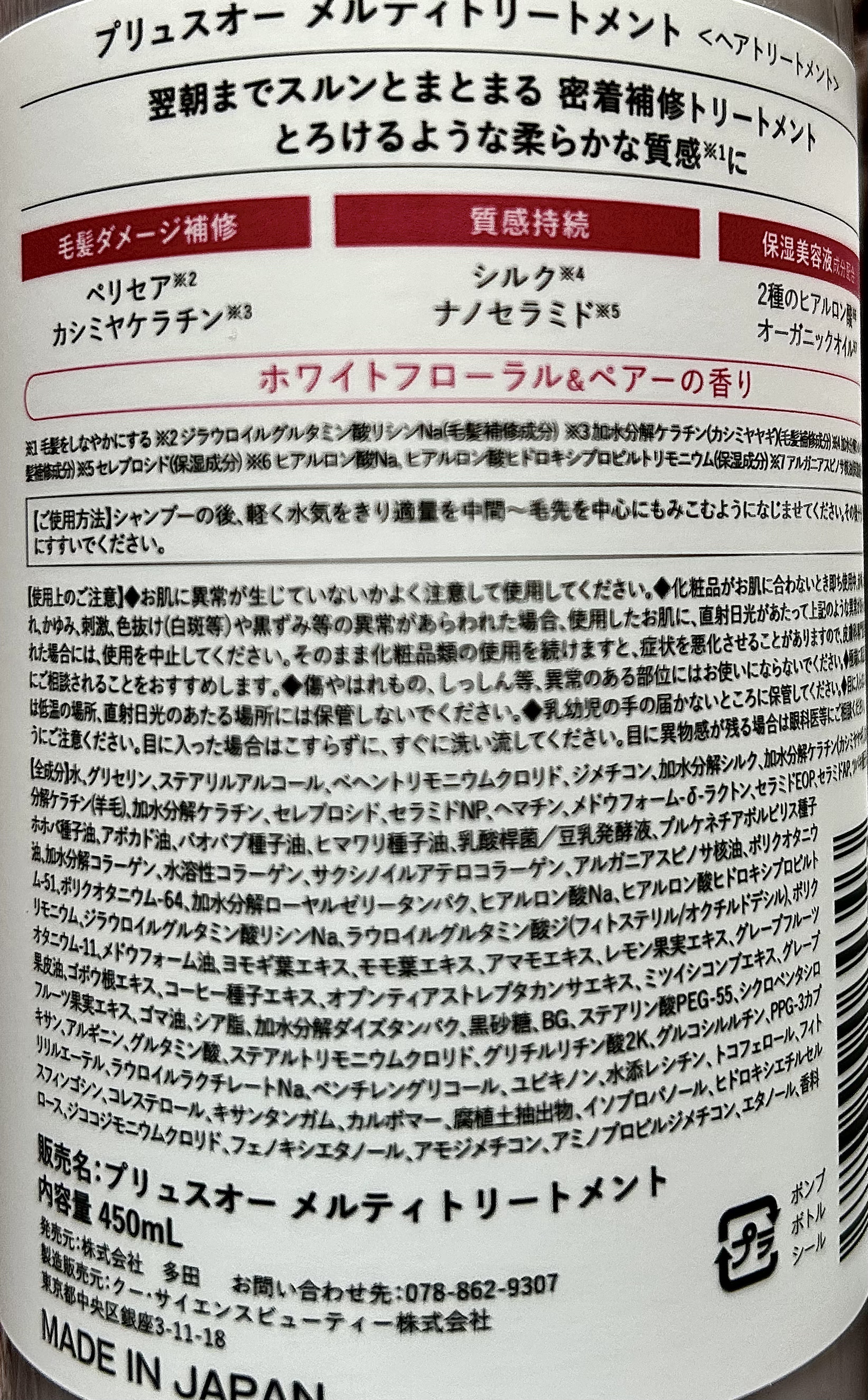 - <メルティシャンプー> 水、グリセリン、コカミドプロピルベタイン、ラウラミドDEA、ココイルメチルタウリンNa、コカミドDEA、ラウロイルメチルアラニンNa、ココイル加水分解コラーゲンK、ココイル加水分解ケラチンK、ココイルグリシンNa、加水分解ケラチン(カシミヤヤギ)、加水分解ケラチン(羊毛)、加水分解シルク、セレブロシド、セラミドNP、ヘマチン、メドウフォーム-δ-ラクトン、セラミドEOP、セラミドAP、ツボクサエキス、ジラウロイルグルタミン酸リシンNa、オプンティアストレプタカンサエキス、異性化糖、アルガニアスピノサ核油、ヒアルロン酸Na、ヒアルロン酸ヒドロキシプロピルトリモニウム、EDTA-3Na、加水分解ダイズタンパク、加水分解ローヤルゼリータンパク、ポリクオタニウム-10、ポリクオタニウム-7、アボカド油、バオバブ種子油、ポリクオタニウム-52、ヒマワリ種子油、ホホバ種子油、ヤシ油アルキルグルコシド、プロポリスエキス、シャクヤク根エキス、オタネニンジン根エキス、カミツレ花エキス、ハチミツ、ハチミツエキス、ローヤルゼリー、BG、ラウロイルラクチレートNa、ヤシ油脂肪酸PEG-7グリセリル、ジステアリン酸PEG-150、グリチルリチン酸2K、ラウロイルグルタミン酸ジ(フィトステリル/オクチルドデシル)、PEG-32、PEG-1ラウリルグリコール、トコフェロール、フィトスフィンゴシン、キサンタンガム、カルボマー、エチドロン酸、コレステロール、エチドロン酸4Na、クエン酸、メチルパラベン、エタノール、フェノキシエタノール、香料 <メルティトリートメント> 水、グリセリン、ステアリルアルコール、ベヘントリモニウムクロリド、ジメチコン、加水分解シルク、加水分解ケラチン(カシミヤヤギ)、加水分解ケラチン(羊毛)、加水分解ケラチン、セレブロシド、セラミドNP、ヘマチン、メドウフォーム-δ-ラクトン、セラミドEOP、セラミドAP、ツバキ種子油、ホホバ種子油、アボカド油、バオバブ種子油、ヒマワリ種子油、乳酸桿菌/豆乳発酵液、プルケネチアボルビリス種子油、加水分解コラーゲン、水溶性コラーゲン、サクシノイルアテロコラーゲン、アルガニアスピノサ核油、ポリクオタニウム-51、ポリクオタニウム-64、加水分解ローヤルゼリータンパク、ヒアルロン酸Na、ヒアルロン酸ヒドロキシプロピルトリモニウム、ジラウロイルグルタミン酸リシンNa、ラウロイルグルタミン酸ジ(フィトステリル/オクチルドデシル)、ポリクオタニウム-11、メドウフォーム油、ヨモギ葉エキス、モモ葉エキス、アマモエキス、レモン果実エキス、グレープフルーツ果皮油、ゴボウ根エキス、コーヒー種子エキス、オプンティアストレプタカンサエキス、ミツイシコンブエキス、グレープフルーツ果実エキス、ゴマ油、シア脂、加水分解ダイズタンパク、黒砂糖、BG、ステアリン酸PEG-55、シクロペンタシロキサン、アルギニン、グルタミン酸、ステアルトリモニウムクロリド、グリチルリチン酸2K、グルコシルルチン、PPG-3カプリリルエーテル、ラウロイルラクチレートNa、ペンチレングリコール、ユビキノン、水添レシチン、トコフェロール、フィトスフィンゴシン、コレステロール、キサンタンガム、カルボマー、腐植土抽出物、イソプロパノール、ヒドロキシエチルセルロース、ジココジモニウムクロリド、フェノキシエタノール、アモジメチコン、アミノプロピルジメチコン、エタノール、香料 <メルティシャンプー詰替> 水、グリセリン、コカミドプロピルベタイン、ラウラミドDEA、ココイルメチルタウリンNa、コカミドDEA、ラウロイルメチルアラニンNa、ココイル加水分解コラーゲンK、ココイル加水分解ケラチンK、ココイルグリシンNa、加水分解ケラチン(カシミヤヤギ)、加水分解ケラチン(羊毛)、加水分解シルク、セレブロシド、セラミドNP、ヘマチン、メドウフォーム-δ-ラクトン、セラミドEOP、セラミドAP、ツボクサエキス、ジラウロイルグルタミン酸リシンNa、オプンティアストレプタカンサエキス、異性化糖、アルガニアスピノサ核油、ヒアルロン酸Na、ヒアルロン酸ヒドロキシプロピルトリモニウム、EDTA-3Na、加水分解ダイズタンパク、加水分解ローヤルゼリータンパク、ポリクオタニウム-10、ポリクオタニウム-7、アボカド油、バオバブ種子油、ポリクオタニウム-52、ヒマワリ種子油、ホホバ種子油、ヤシ油アルキルグルコシド、プロポリスエキス、シャクヤク根エキス、オタネニンジン根エキス、カミツレ花エキス、ハチミツ、ハチミツエキス、ローヤルゼリー、BG、ラウロイルラクチレートNa、ヤシ油脂肪酸PEG-7グリセリル、ジステアリン酸PEG-150、グリチルリチン酸2K、ラウロイルグルタミン酸ジ(フィトステリル/オクチルドデシル)、PEG-32、PEG-1ラウリルグリコール、トコフェロール、フィトスフィンゴシン、キサンタンガム、カルボマー、エチドロン酸、コレステロール、エチドロン酸4Na、クエン酸、メチルパラベン、エタノール、フェノキシエタノール、香料 <メルティトリートメント詰