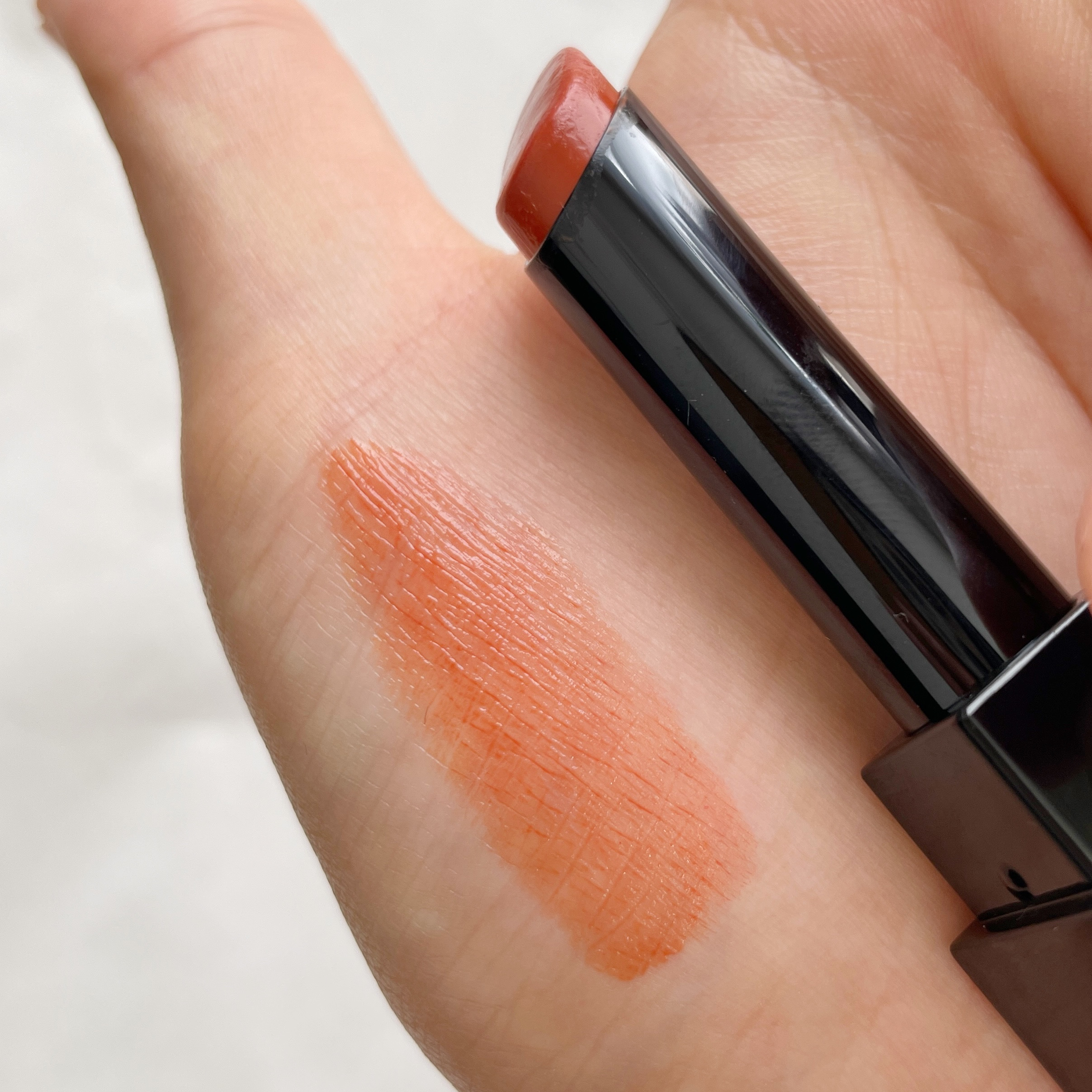 テクスチャーはクリームアイシャドウなので体温でジュワッと溶ける感じなのですが他社のクリームアイシャドウよりも柔らかめだなと感じました。 手で取ると少量でもすごく綺麗なラメ感が出るのでとにかくめちゃくちゃ可愛いです。 お肌に乗せた時の色と仕上がりにめちゃくちゃテンションが上がりました!ほんっっとに可愛いオレンジブラウン! 薄くのばして重ねてもあまりムラが気にならないのでパパッとメイクするときにも使えるしこれ単色でもすごく可愛い。 クリームアイシャドウの中ではまぶたの溝に溜まる量も少なめに感じました。もちろんほんのり溜まっちゃうんですがカラーのおかげもありあまり気にならないかな?という感じ。 カラーの可愛さに本当にびっくりしました。そしてクリームアイシャドウとしてもしっとり感と密着感のバランスが程よくてすごく使いやすく感じています。