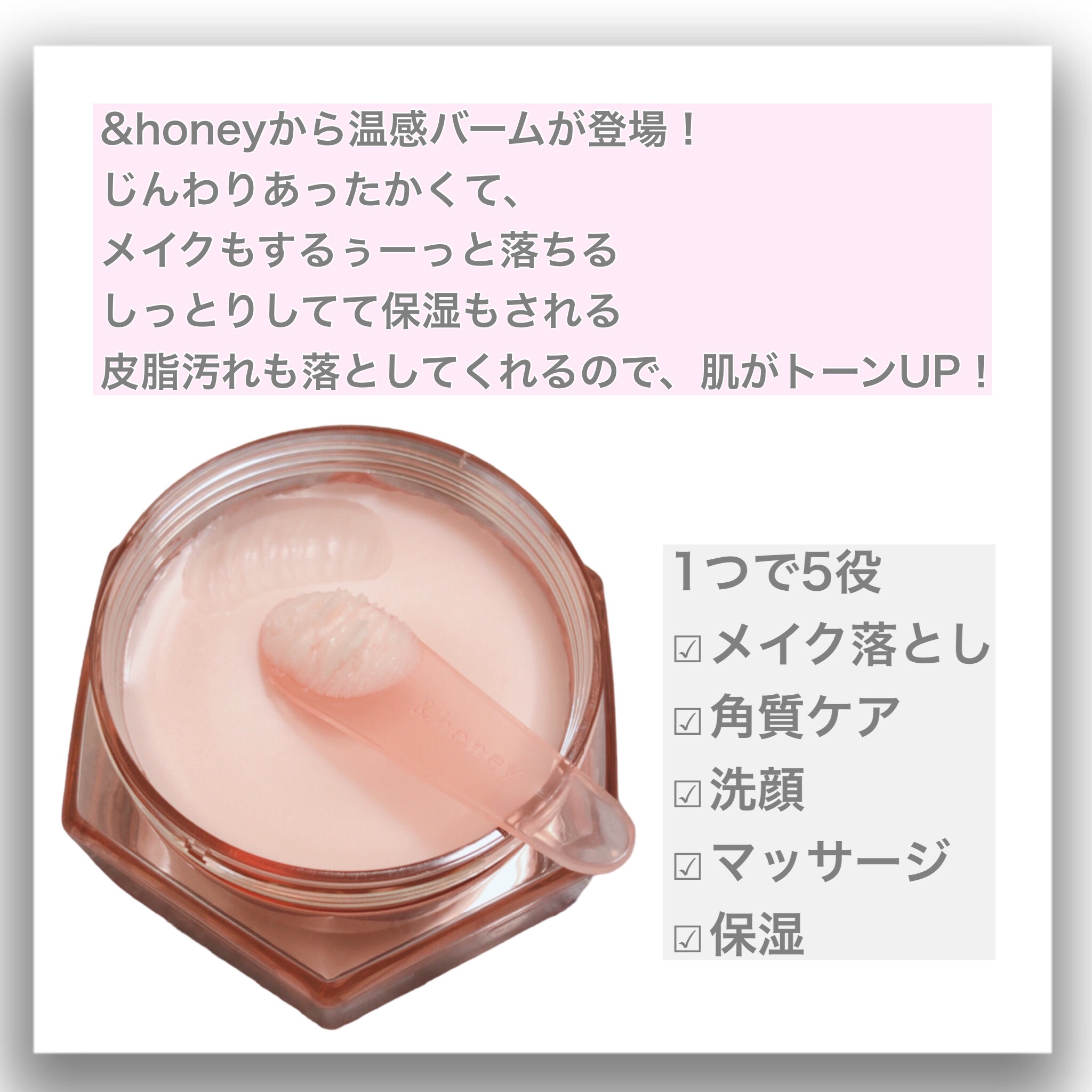- &honey クレンジングバームから じんわりあったか温感バーム【メルティホット】シリーズ とろけるあったかバームがじんわりお肌をやわらげることで、 メイクや古い角質を浮かし、なめらかなお肌へ導きます。 製品の90%以上を保湿・整肌成分で構成しW酵素成分を配合することで、くすみ※をケアして肌トーンUP 香りは甘く華やかなシャワーローズハニーの香り。 ※古い角質や汚れによる
