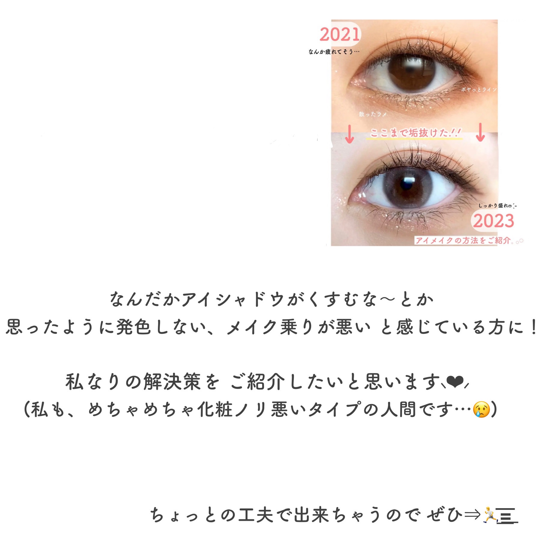 プチプラかつドラッグストアで買えるアイテムのみでやってみたので、是非ご覧下さい🕊 左上のカラーを指でアイホール全体に。(軽く!) 右上のカラーをブラシで目尻に。 薄いカラーを取って、手の甲で濃さを調節してから塗ります。 ピンクを入れるとぷくっとかわいい涙袋に🥺 力を入れて挟み込みすぎないように注意⚠️ 根元から優しく上げると自然なカールが付きます💡 アイラインは、ペン先で描くイメージで、目の形に沿って目尻のみひきます. あまり長くしすぎると不自然なので注意です⚠️ アイラインが浮いちゃう、って方は上からアイシャドウでぼかすとマシになります📢 涙袋の影は、描いたらすぐぼかす!がポイント💡