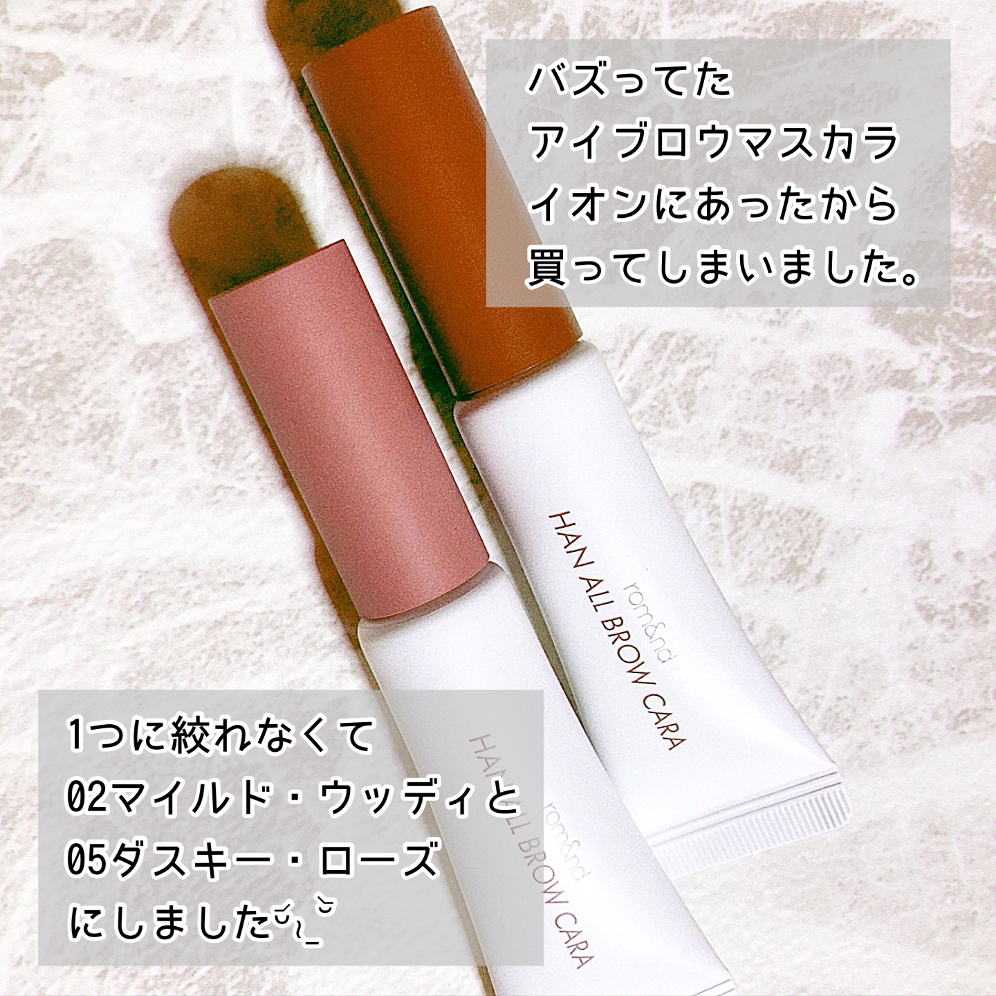 rom&ndハンオールブロウカラ02マイルド・ウッディ05ダスキー・ローズさっそく使ってみました。すごくぬりやすかったです。地肌には全然つかず眉にだけきれいに色のりました。おまけに全然落ちません。06の日本限定色の赤っぽいのも欲しいな.。◦♡...