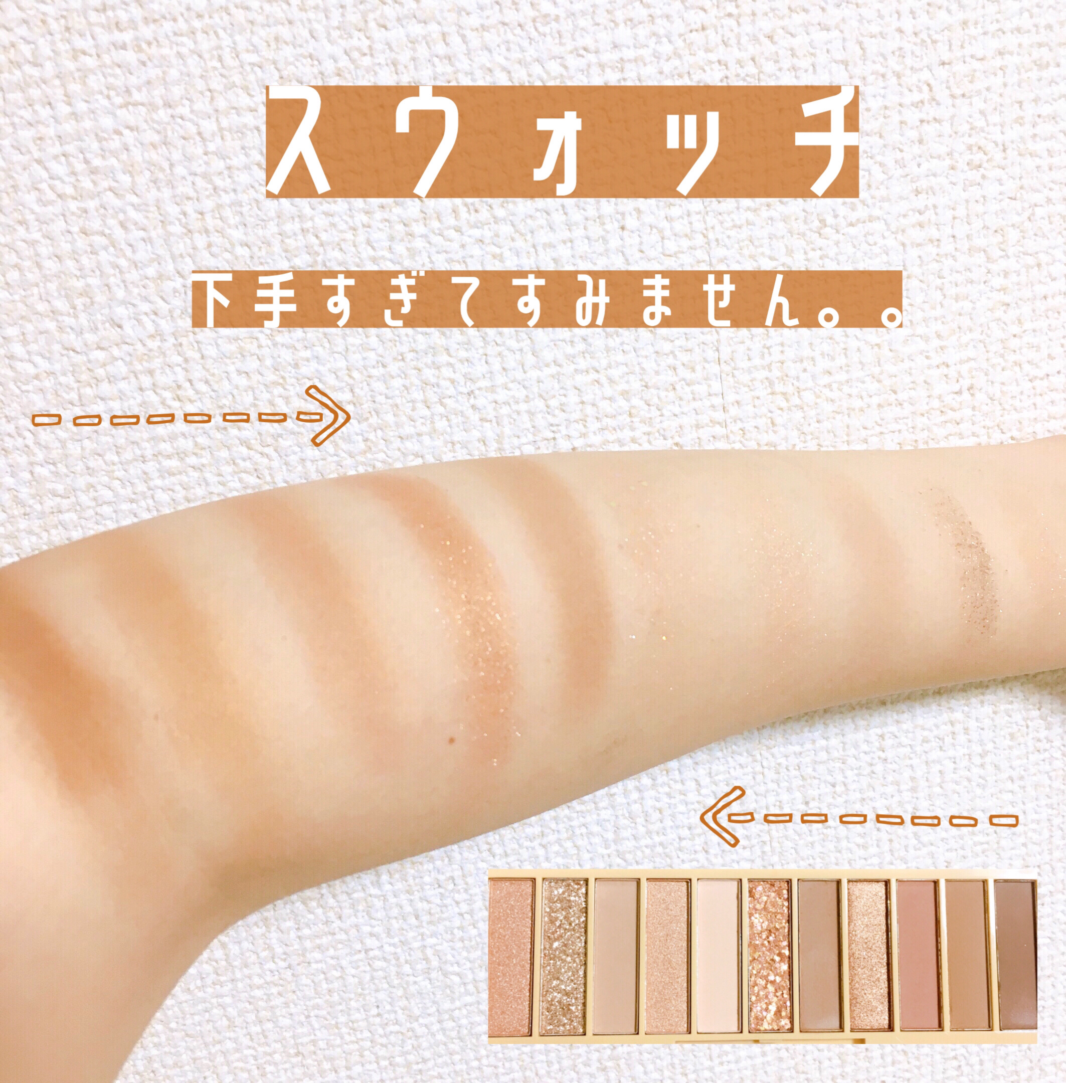 *全体的にすごく発色が良く、11色も入っていて220円で買えるのはさすがにバグレベルでした😋 *上から6つめのカラーは、ラメが大きめになっていてかわいかったです!ただすごく柔らかいので色を取る際はあまり力をこめない方がよさそうです🙌🏻 *その1つ下の肌色はすごく肌なじみのいい色で、私はベースカラーとして使おうと思います👍🏻 *腕に色を乗せて少し経ってからティッシュで擦ってみましたがほとんど落ちなかったです!(色によっては落ちやすいもの有) とりあえずこれ1個もってたら11色もあるのですごく便利です!買って損なしかと!そしてなにより220円という破格の値段❕皆さんもぜひげっとしてみて下さい~🌸