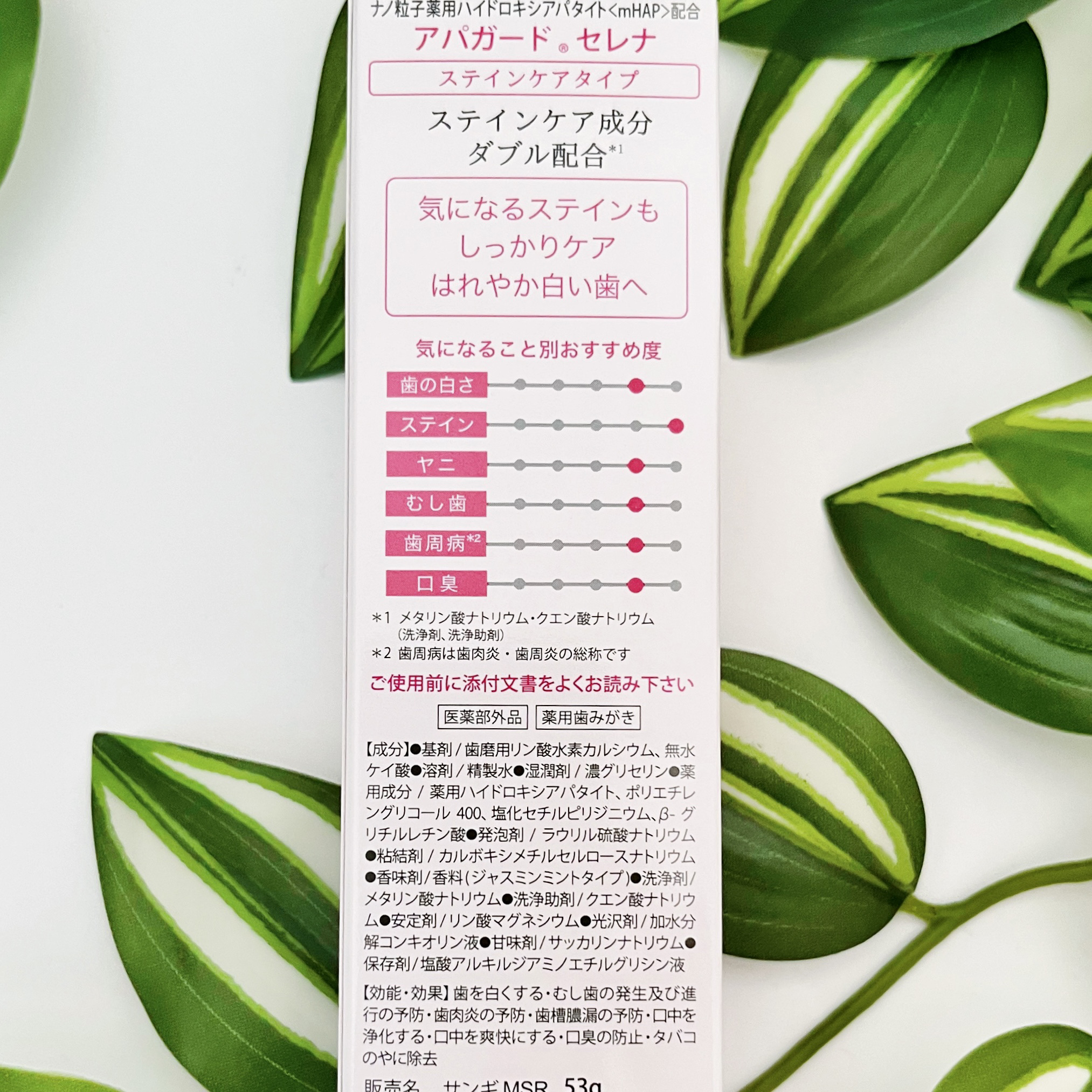 - 【医薬部外品】 美白歯みがき「アパガード」シリーズのステインケアタイプ。サンギ開発のむし歯予防成分「薬用ハイドロキシアパタイト」を配合。歯とほぼ同じ成分(歯のエナメル質の97%はハイドロキシアパタイト)で、エナメル質にアプローチ! さらにステインケア成分をダブル配合*し、コーヒーや紅茶・ワインなどの気になる着色汚れを落とします。 ステインケアではれやか白い歯に。 *メタリン酸ナトリウム(洗浄剤)・クエン酸ナトリウム(洗浄助剤) ●医薬部外品/薬用歯みがき 販売名:サンギMSR