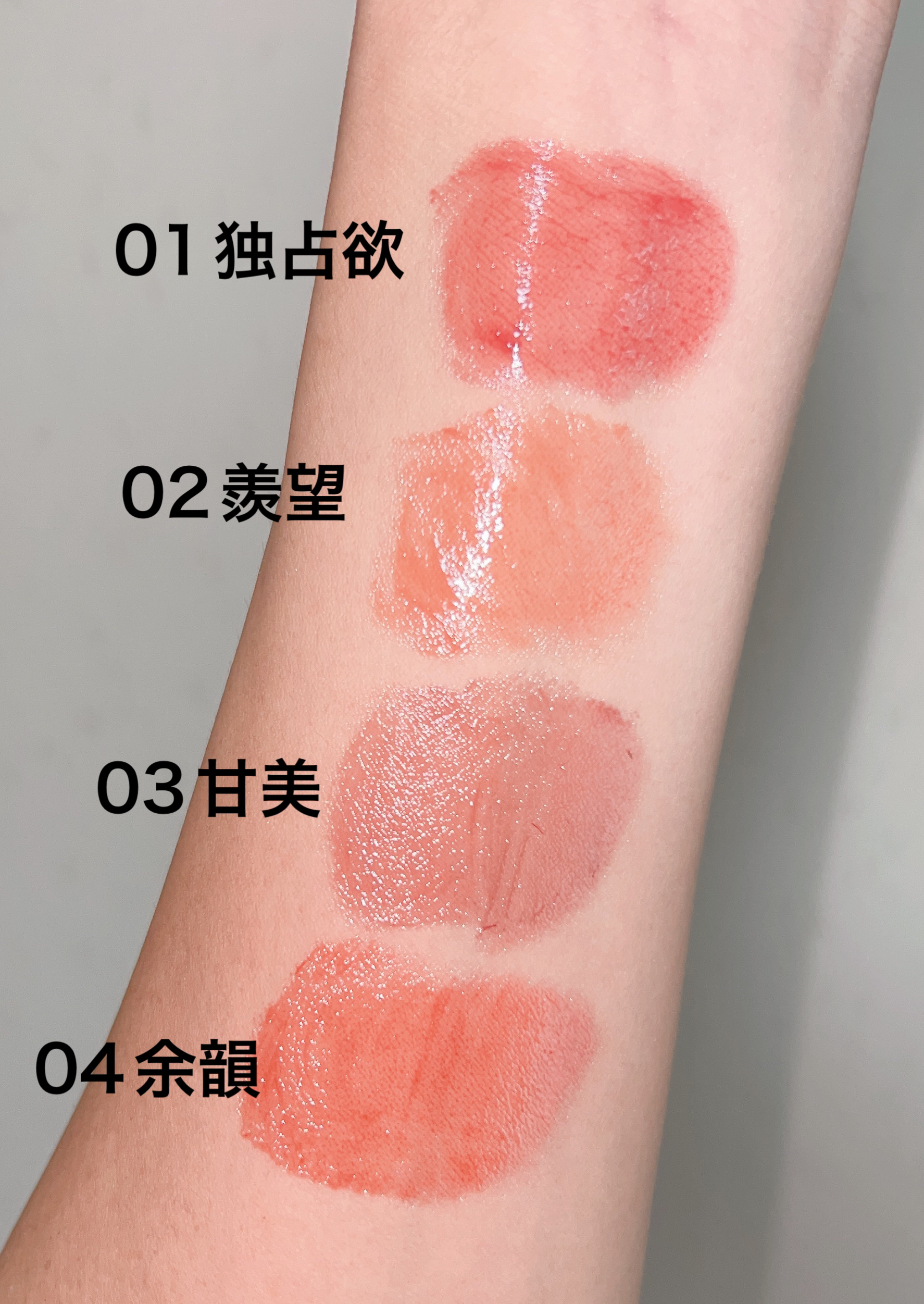 - <01 独占欲> ビリンゴ酸ジイソステアリル、水、ビスジグリセリルポリアシルアジペート-2、トリメチルシロキシフェニルジメチコン、水添ポリイソブテン、ポリフェニルシル セスキオキサン、ダイマージリノール酸ダイマージリノレイルビス(ベヘニル/イソステアリル/フィトステリル)、ジグリセリン、セチルPEG/PPG-10/1ジメチコン、1,2-ヘキサンジオール、セテアレス-20、(アクリル酸ヒドロキシエチル/アクリロイルジメチルタウリンNa)コポリマー、ポリソルベート60、スクワラン、フェノキ シエタノール、ベヘニルアルコール、メントキシプロパンジオール、酸化チタン、ポリグリセリン-3、エチルヘキシルグリセリン、黄5、赤227、イソステアリン酸 ソルビタン、グリセリン、赤104(1)、黄4、水酸化AI、ポリアクリル酸アンモニウム、青1、BG、ツバキ種子油、アルガニアスピノサ核油、アーモンド油、ティー ツリー葉油、ハチミツエキス <02 羨望> リンゴ酸ジイソステアリル、水、ビスジグリセリルポリアシルアジペート-2、トリメチルシロキシフェニルジメチコン、水添ポリイソブテン、ポリフェニルシルセ スキオキサン、ダイマージリノール酸ダイマージリノレイルビス(ベヘニル/イソステアリル/フィトステリル)、ジグリセリン、セチルPEG/PPG-10/1ジメチコン、1,2-ヘキサンジオール、セテアレス-20、(アクリル酸ヒドロキシエチル/アクリロイルジメチルタウリンNa)コポリマー、ポリソルベート60、スクワラン、フェノキ シエタノール、ベヘニルアルコール、酸化チタン、メントキシプロパンジオール、ポリグリセリン-3、エチルヘキシルグリセリン、黄5、黄4、赤227、イソステア リン酸ソルビタン、グリセリン、水酸化AI、ポリアクリル酸アンモニウム、BG、青1、アルガニアスピノサ核油、ツバキ種子油、アーモンド油、ティーツリー葉 油、ハチミツエキス <03 甘美> リンゴ酸ジイソステアリル、水、ビスジグリセリルポリアシルアジペート-2、トリメチルシロキシフェニルジメチコン、ポリフェニルシルセスキオキサン、ダイマージ リノール酸ダイマージリノレイルビス(ベヘニル/イソステアリル/フィトステリル)、水添ポリイソブテン、ジグリセリン、セチルPEG/PPG-10/1ジメチコン、1,2-ヘキ サンジオール、セテアレス-20、(アクリル酸ヒドロキシエチル/アクリロイルジメチルタウリンNa)コポリマー、ポリソルベート60、スクワラン、フェノキシエタノール、ベヘ ニルアルコール、メントキシプロパンジオール、酸化チタン、エチルヘキシルグリセリン、酸化鉄、黄4、赤227、イソステアリン酸ソルビタン、黄5、赤104、ポリアクリル酸 アンモニウム、水酸化Al、青1、BG、ツバキ種子油、アルガニアスピノサ核油、ティーツリー葉油、アーモンド油、ハチミツエキス、テトラ(ジ-t-ブチルヒドロキシヒドロケイ ヒ酸)ペンタエリスリチル <04 余韻> リンゴ酸ジイソステアリル、水、ビスジグリセリルポリアシルアジペート-2、トリメチルシロキシフェニルジメチコン、ポリフェニルシルセスキオキサン、ダイマージリノール酸ダイマージリノレイルビス(ベヘニル/イソステアリル/フィトステリル)、水添ポリイソブテン、ジグリセリン、セチルPEG/PPG-10/1ジメチコン、1,2-ヘキサンジオール、セテアレス-20、(アクリル酸ヒドロキシエチル/アクリロイルジメチルタウリンNa)コポリマー、ポリソルベート60、スクワラン、フェノキシエタノール、ベヘニルアルコール、酸化鉄、メントキシプロパンジオール、エチルヘキシルグリセリン、酸化チタン、黄5、赤227、イソステアリン酸ソルビタン、黄4、赤104、ポリアクリル酸アンモニウム、青1、水酸化Al、BG、ツバキ種子油、アルガニアスピノサ核油、ティーツリー葉油、アーモンド油、ハチミツエキス、テトラ(ジ-t-ブチルヒドロキシヒドロケイヒ酸)ペンタエリスリチル <05 イエローシロップ> ビスジグリセリルポリアシルアジペート-2、リンゴ酸ジイソステアリル、トリイソステアリン酸ポリグリセリル-2、(ヒマシ油/IPDI)コポリマー、ポリ メチルシルセスキオキサン、1,2-ヘキサンジオール、トリオクタノイン、マイクロクリスタリンワックス、ポリヒドロキシステアリン酸、ジメチルシリル化シリカ、トリ(カプリル 酸/カプリン酸)グリセリル、酢酸トコフェロール、メントキシプロパンジオール、ホウケイ酸(Ca/Al)、酸化鉄、合成フルオロフロゴパイト、イソステアリン酸、レシチン ミリスチン酸イソプロピル、パルミチン酸エチルヘキシル、酸化チタン、ポリリシノレイン酸ポリグリセリル-3、ティーツリー葉油、ツバキ種子油、アーモンド油、アルガニアスピノサ核油、水、酸化スズ、BG、ハチミツエキス、フェノキシエタノール、エチルヘキシルグリセリン