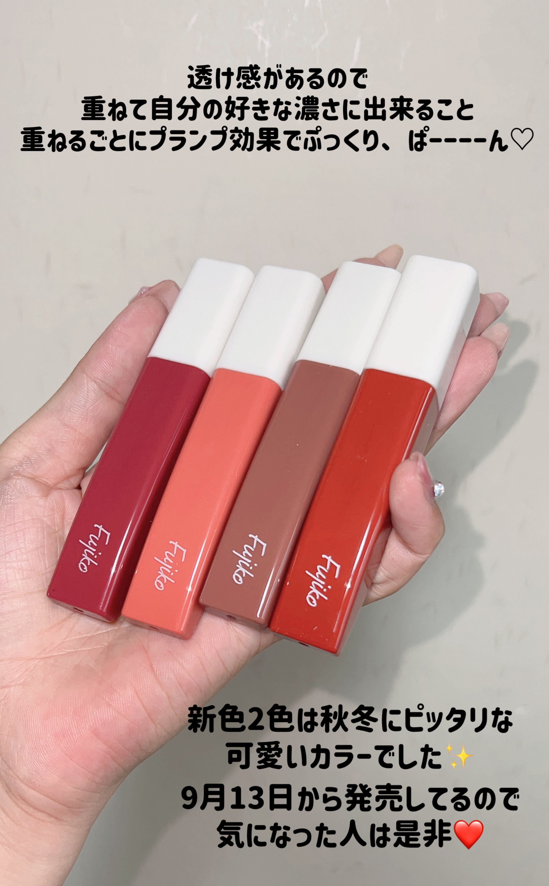 - フジコの新リップは、重ねるほどにパーンと膨んでみえるプランプティント*1。 ぷっくりと存在感のあるリップメイクで唇を主役に。 <プランプ成分(清涼成分)> "メントキシプロパンジオール”採用。 血色感、ボリューム感、クーリング感を演出します。 <オイルウォーターティント処方> 軽やかなオイルが唇に均一に伸び広がり、 FIXING。 時間が経ってもボリューム感と光沢感を演出。 しかもティントだから“落ちにくい”(*2)。 <5種の美容保湿成分配合> アルガンオイル・ツバキ種子油・アーモンド油 ティーツリー葉油・ハチミツエキス *1全てメイクアップ効果 *2効果・効能には個人差があります。
