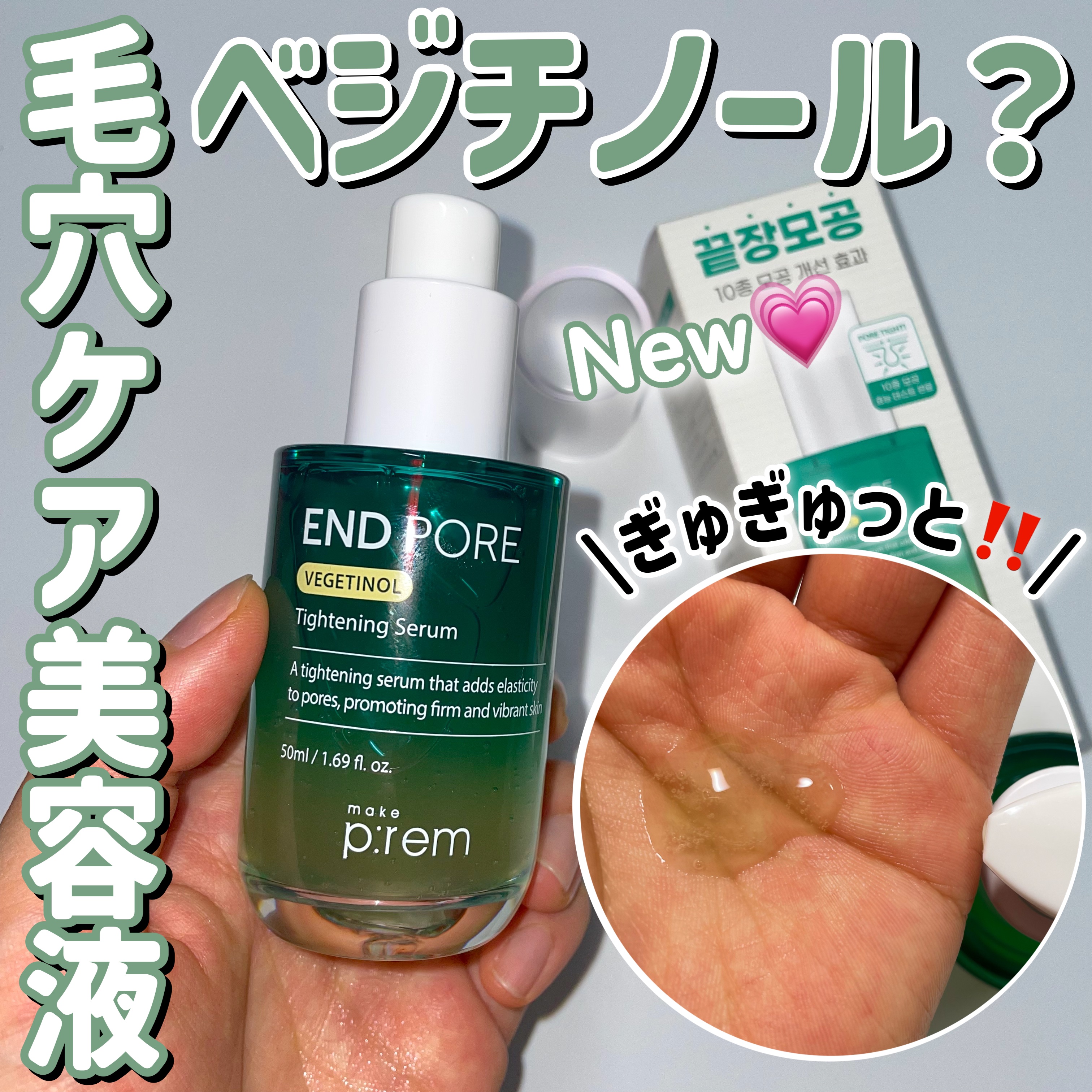 makepremエンドポアベジチノールタイト二ングセラムmakep:rem(メイクプレム)のエンドポアベジチノールタイトニングセラム使ってみました。毛穴の引き締めに特化した美容液(セラム)レチノールに似た働きをする植物由来成分「バクチオール」...