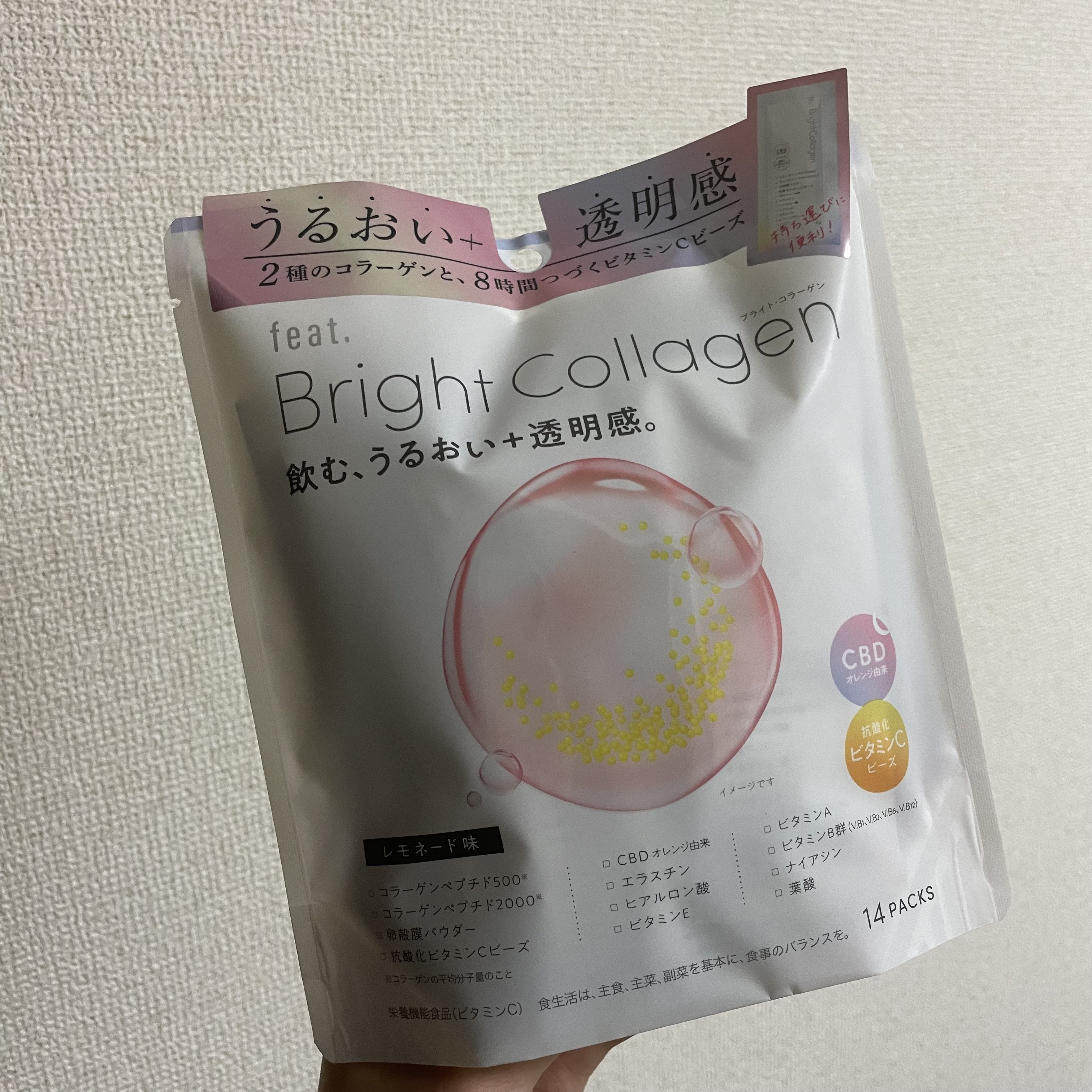 - サイズの異なるコラーゲンペプチドと、時間をかけてじっくり溶ける多重構造ビタミンCビーズを1包に詰め込んだ、キレイ習慣をサポートする栄養機能食品。多忙な毎日をサポートするアメリカで話題のCBDをはじめ、年齢とともに減少するエラスチンやヒアルロン酸、ビタミンA、ビタミンE、ビタミンB群、葉酸も同時に摂れます。 ●レモネード味●持ち運びに便利なスティックタイプ(そのまま飲んでも、水に溶かして飲んでも) 【栄養機能食品(ビタミンC)】ビタミンCは、皮膚や粘膜の健康維持を助けるとともに、抗酸化作用を持つ栄養素です。 ●本品は、多量摂取により疾病が治癒したり、より健康が増進するものではありません。●1日の摂取目安量を守ってください。●本品は、特定保健用食品と異なり、消費者庁長官による個別審査を受けたものではありません。●食生活は、主食、主菜、副菜を基本に、食事のバランスを。